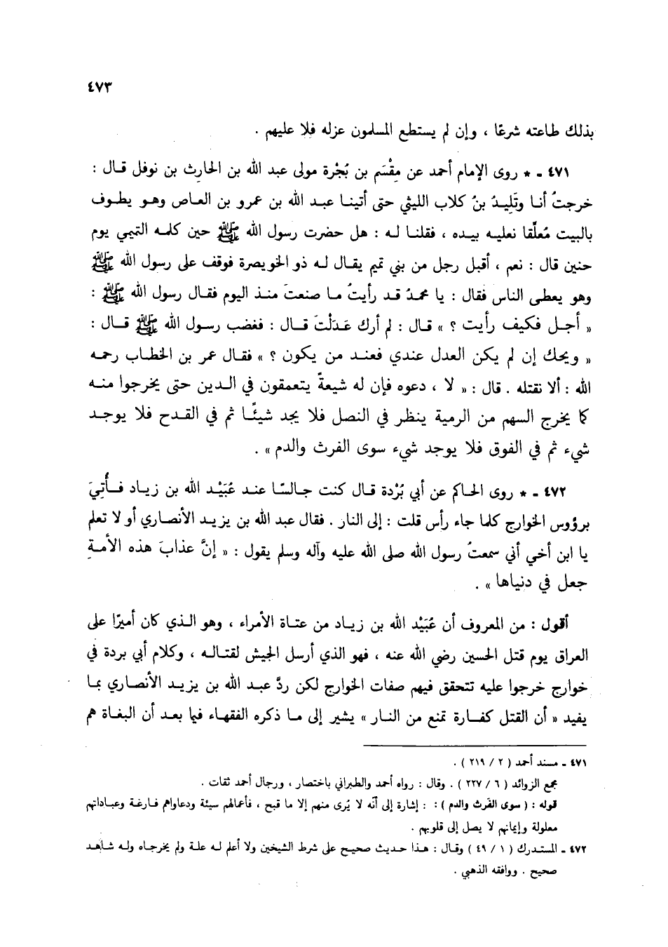 471 - * روى الإمام أحمد عن مِقْسم بن بُجرة مولى عبد الله بن الحارث بن نوفل قال: خرجتُ أنا وتليدُ بن كلاب الليثي حتى أتينا عبد الله بن عمرو بن العاص وهو يطوف بالبيت مُعلقاً نعليه بيده، فقلنا له: هل حضرت رسول الله صلى الله عليه وسلم حين كلمه التميمي يوم حنين قال: نعم، أقبل رجل من بني تميم يقال له ذو الخويصرة فوقف على رسول الله صلى الله عليه وسلم وهو يعطي الناس فقال: يا محمدُ قد رأيتُ ما صنعت منذ اليوم فقال رسول الله صلى الله عليه وسلم: "أجل فكيف رأيت؟ " قال: لم أرك عدلت قال: فغضب رسول الله صلى الله عليه وسلم قال: "ويحك إن لم يكن العدل عندي فعند من يكون؟ " فقال عمر بن الخطاب رحمه الله: ألا تقتله. قال: "لا، دعوه فإن له شيعةً يتعمقون في الدين حتى يخرجوا منه كما يخرج السهم من الرمية ينظر في النصل فلا يجد شيئاً ثم في القدح فلا يوجد شيء ثم في الفوق فلا يوجد شيء سوى الفرث والدم".