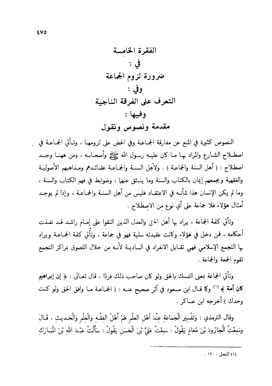 النصوص كثيرة في المنع عن مفارقة الجماعة وفي الحض على لزومها، وتأتي الجماعة في اصطلاح الشارع والمراد بها ما كان عليه رسول الله صلى الله عليه وسلم وأصحابه، ومن ههنا وجد اصطلاح: (أهل السنة والجماعة). ولأهل السنة والجماعة عقائدهم ومذاهبهم الأصولية والفقهية ويجمعهم إيمان بالكتاب والسنة وما ينبثق عنهما، وضوابط في فهم الكتاب والسنة، وما لم يكن الإنسان هذا شأنه في الاعتقاد فليس من أهل السنة والجماعة، وإذا لم يوجد أمثال هؤلاء فلا جماعة على أي نوع من الاصطلاح.