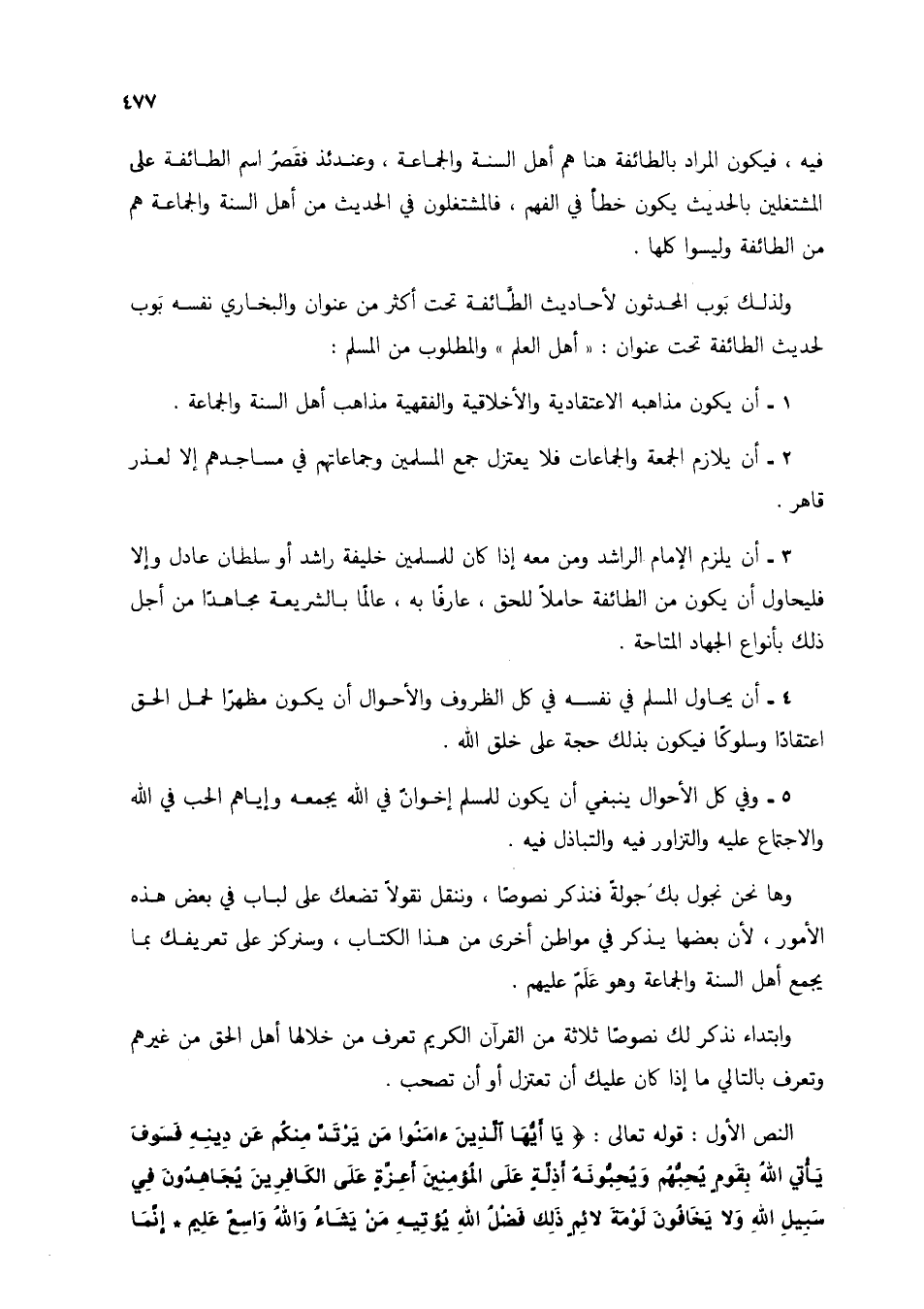 النص الأول: قوله تعالى: {يَاأَيُّهَا الَّذِينَ آمَنُوا مَنْ يَرْتَدَّ مِنْكُمْ عَنْ دِينِهِ فَسَوْفَ يَأْتِي اللَّهُ بِقَوْمٍ يُحِبُّهُمْ وَيُحِبُّونَهُ أَذِلَّةٍ عَلَى الْمُؤْمِنِينَ أَعِزَّةٍ عَلَى الْكَافِرِينَ يُجَاهِدُونَ فِي سَبِيلِ اللَّهِ وَلَا يَخَافُونَ لَوْمَةَ لَائِمٍ ذَلِكَ فَضْلُ اللَّهِ يُؤْتِيهِ مَنْ يَشَاءُ وَاللَّهُ وَاسِعٌ عَلِيمٌ * إِنَّمَا