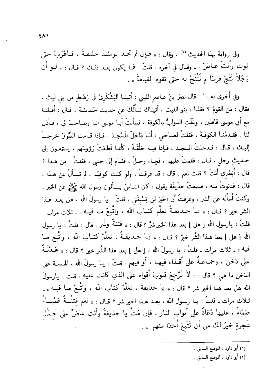 وفي أخرى له (2): قال نصر بن عاصمٍ الليثي: أتينا اليشكري في رهطٍ من بني ليث، فقال: من القوم؟ فقلنا: بنو الليث، أتيناك نسألك عن حديث حُذيفة، قال: أقبلنا مع أبي موسى قافلين، وغلتِ الدواب بالكوفة، فسألت أبا موسى أنا وصاحب لي، فأذن لنا، فقدمنا الكوفة، فقلت لصاحبي: أنا داخل المسجد، فإذا قامت السوق خرجت إليك، قال: فدخلتُ المسجد، فإذا فيه حلقةً، كأنما قطعت رؤوسهم، يستمعون إلى حديث رجلٍ، قال: فقمتُ عليهم، فجاء رجلٌ، فقام إلى جنبي، فقلتُ: من هذا؟ قال: أبصري أنت؟ قلت نعم. قال: قد عرفتُ، ولو كنت كوفياً، لم تسأل عن هذا، قال: فدنوت منه، فسمعتُ حذيفة يقول: كان الناس يسألون رسول الله صلى الله عليه وسلم عن الخير، وكنت أسأله عن الشر، وعرفت أن الخير لن يسبقني، قلت: يا رسول الله، هل بعد هذا الشر خير؟ قال: "يا حذيفة تعلَّم كتاب الله، واتبع ما فيه" -ثلاث مرات- قلتُ: يا رسول الله [هل] بعد هذا الخير شرٌّ؟ قال: "فتنةٌ وشر" قال: قلتُ: يا رسول الله [هل] بعد هذا الشر خيرٌ؟ قال: "يا حذيفةُ، تعلم كتاب الله، واتبع ما فيه" - ثلاث مرات- قلت: يا رسول الله، [هل] بعد هذا الشر خير؟ قال: "هُدنةً على دخن، وجماعةً على أقذاء فيها، أو فيهم" قلتُ: يا رسول الله، الهدنة على الدخن ما هي؟ قال: "لا ترجعُ قلوب أقوام على الذي كانت عليه" قلت: يا رسول الله هل بعد هذا الخير شر؟ قال: "يا حذيفة، تعلم كتاب الله، واتبع ما فيه" - ثلاث مرات- قلت: يا رسول الله، بعد هذا الخير شر؟ قال: "نعم فتنةٌ عمياءُ صماءُ، عليها دُعاةٌ على أبواب النار، فإن مُتَّ يا حذيفةُ وأنت عاضٌّ على جذل شجرةٍ خيرٌ لك من أن تتبع أحداً منهم".