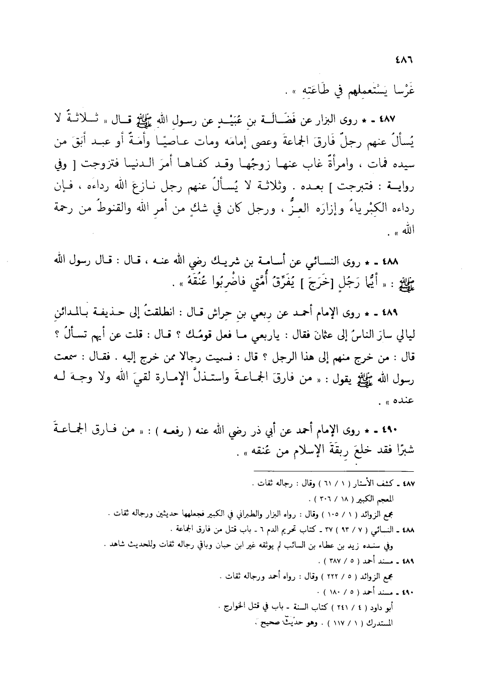 490 - * روى الإمام أحمد عن أبي ذر رضي الله عنه (رفعه): "من فارق الجماعة شبراً فقد خلع ربقة الإسلام من عُنقه.
