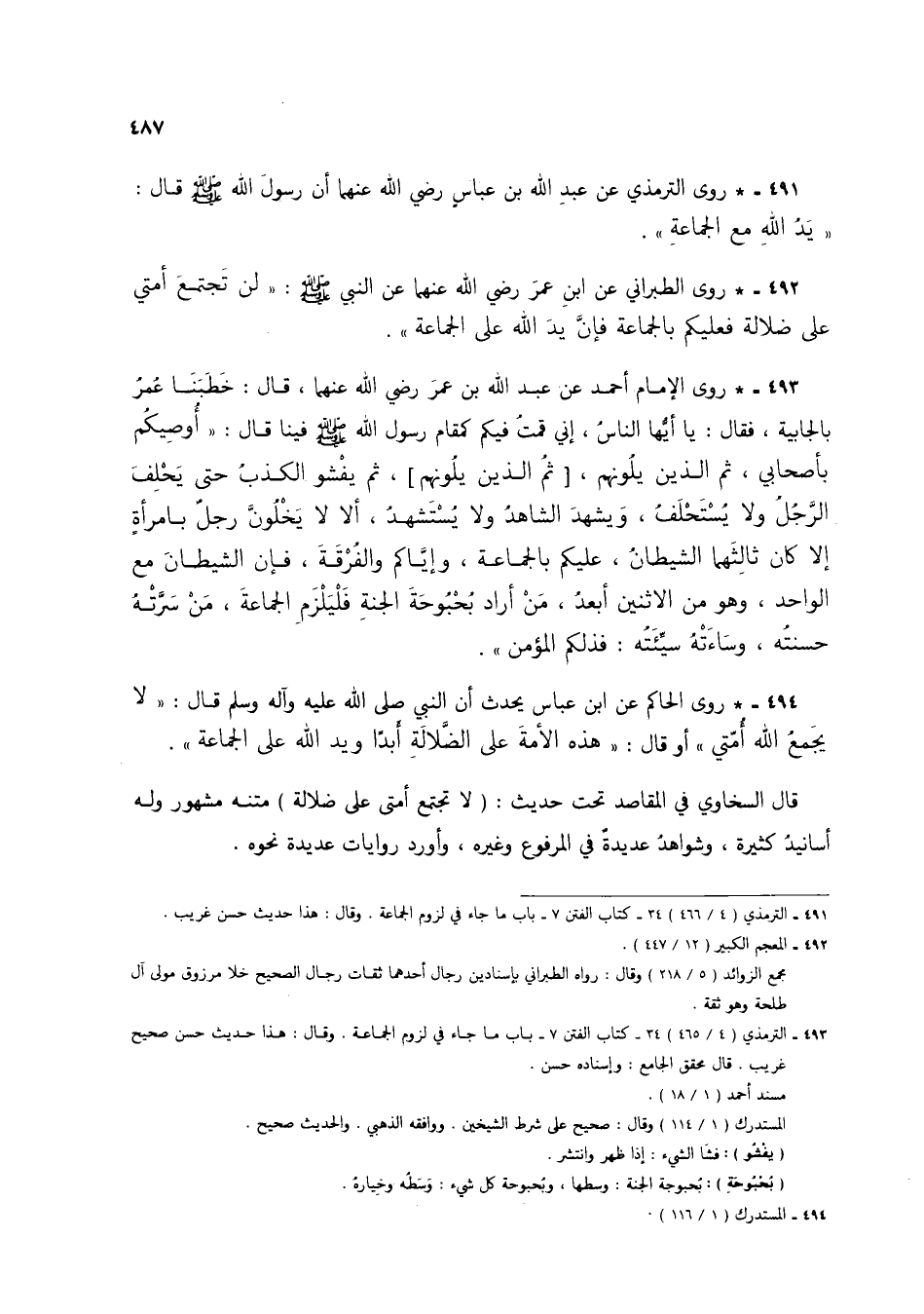 492 - * روى الطبراني عن ابن عمر رضي الله عنهما عن النبي صلى الله عليه وسلم: "لن تجتمع أمتي على ضلالة فعليكم بالجماعة فإن يد الله على الجماعة".