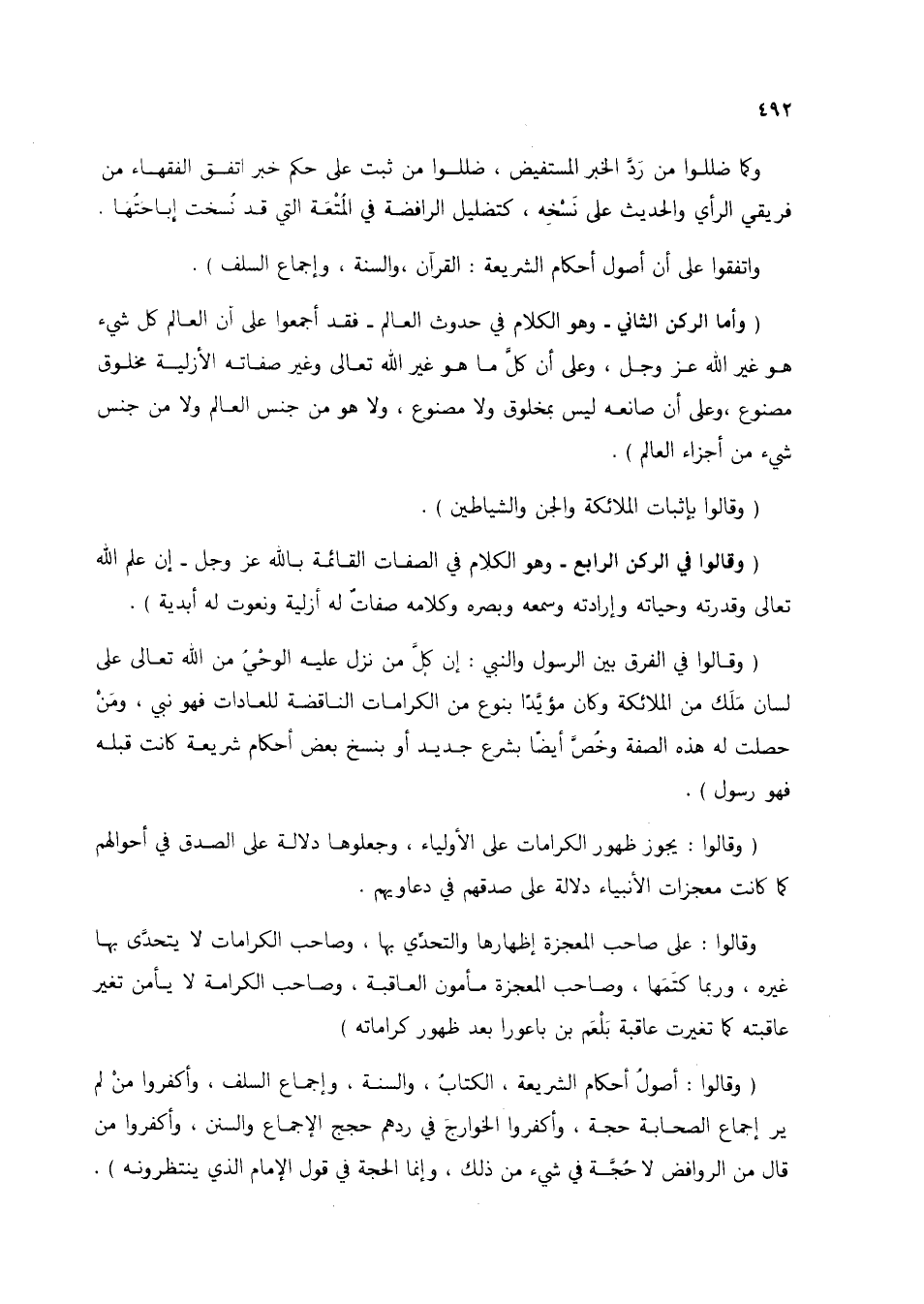 (وقالوا: أصول أحكام الشريعة، الكتابُ، والسنة، وإجماع السلف، وأكفروا من لم ير إجماع الصحابة حجة، وأكفروا الخوارج في ردهم حجج الإجماع والسنن، وأكفروا من قال من الروافض لا حُجة في شيء من ذلك، وإنما الحجة في قول الإمام الذي ينتظرونه).