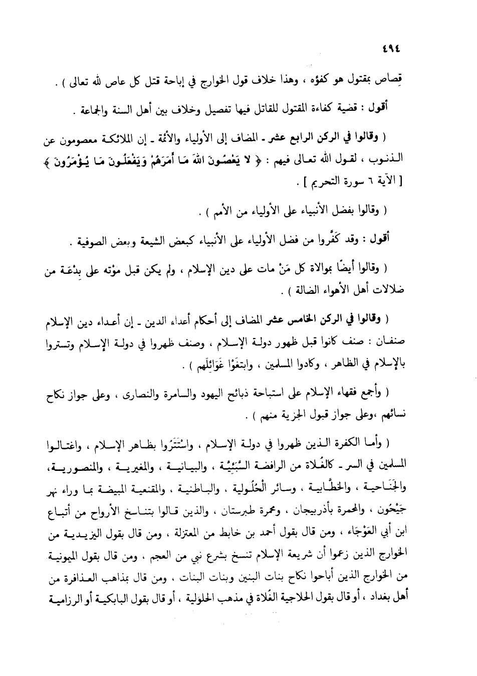 (وأما الكفرة الذين ظهروا في دولة الإسلام، واستتروا بظاهر الإسلام، واغتالوا المسلمين في السر- كالغُلاة من الرافضة السبئية، والبيانية، والمغيرية، والمنصورية، والجناحية، والخُطابية، وسائر الحلولية، والباطنية، والمقنعية المبيضة بما وراء نهر جيحُون، والمحمرة بأذربيجان، ومحمرة طبرستان، والذين قالوا بتناسخ الأرواح من أتباع ابن أبي العوجاء، ومن قال بقول أحمد بن خابط من المعتزلة، ومن قال بقول اليزيدية من الخوارج الذين زعموا أن شريعة الإسلام تنسخ بشرع نبي من العجم، ومن قال بقول الميمونية من الخوارج الذين أباحوا نكاح بنات البنين وبنات البنات، ومن قال بمذاهب العذافرة من أهل بغداد، أو قال بقول الحلاجية الغُلاة في مذهب الحلولية، أو قال بقول البابكية أو الرزامية