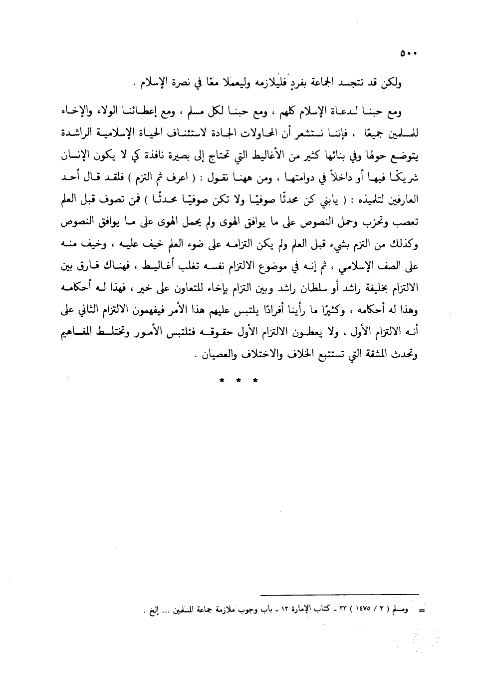 ومع حبنا لدعاة الإسلام كلهم، ومع حبنا لكل مسلم، ومع إعطائنا الولاء والإخاء للمسلمين جميعاً، فإننا نستشعر أن المحاولات الجادة لاستئناف الحياة الإسلامية الراشدة يتوضع حولها وفي بنائها كثير من الأغاليط التي تحتاج إلى بصيرة نافذة كي لا يكون الإنسان شريكاً فيها أو داخلاً في دوامتها، ومن ههنا نقول: (اعرف ثم التزم) فلقد قال أحد العارفين لتلميذه: (يا بني كن محدثاً صوفياً ولا تكن صوفياً محدثاً) فمن تصوف قبل العلم تعصب وتحزب وحمل النصوص على ما يوافق الهوى ولم يحمل الهوى على ما يوافق النصوص وكذلك من التزم بشيء قبل العلم ولم يكن التزامه على ضوء العلم خيف عليه، وخيف منه على الصف الإسلامي، ثم إنه في موضوع الالتزام نفسه تغلب أغاليط، فهناك فارق بين الالتزام بخليفة راشد أو سلطان راشد وبين التزام بإخاء للتعاون على خير، فهذا له أحكامه وهذا له أحكامه، وكثيراً ما رأينا أفراداً يلتبس عليهم هذا الأمر فيفهمون الالتزام الثاني على أنه الالتزام الأول، ولا يعطون الالتزام الأول حقوقه فتلتبس الأمور وتختلط المفاهيم وتحدث المشقة التي تستتبع الخلاف والاختلاف والعصيان.
