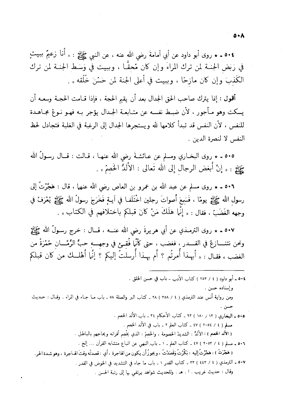505 - * روى البخاري ومسلم عن عائشة رضي الله عنها، قالت: قال رسول الله صلى الله عليه وسلم: "إن أبغض الرجال إلى الله تعالى: الألدُّ الخصمُ".