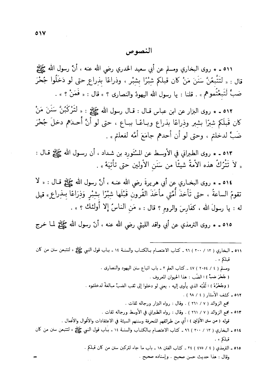 511 - * روى البخاري ومسلم عن أبي سعيد الخدري رضي الله عنه، أن رسول الله صلى الله عليه وسلم قال: "لتتبعن سنن من كان قبلكم شبراً بشبر، وذراعاً بذراعٍ حتى لو دخلوا جُحر ضبٍّ لتبعتموهم". قلنا: يا رسول الله اليهود والنصارى؟ " قال: "فمن؟ ".
