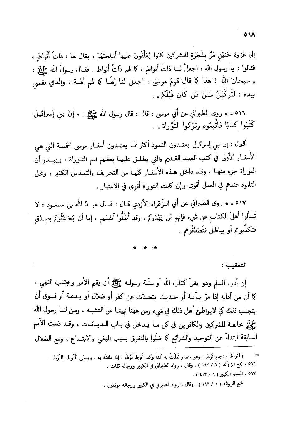 517 - * روى الطبراني عن أبي الزغراء الأزدي قال: قال عبد الله بن مسعود: لا تسألوا أهل الكتاب عن شيء فإنهم لن يهدوكم، وقد أضلوا أنفسهم، إما أن يُحدثوكم بصدقٍ فتكذبوهم أو بباطل فتصدقوهم.