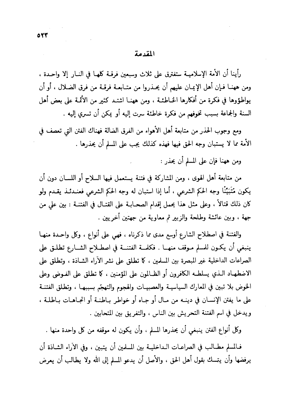 من متابعة أهل الهوى، ومن المشاركة في فتنة يستعمل فيها السلاح أو اللسان دون أن يكون متبيِّناً وجه الحكم الشرعي، أما إذا استبان له وجه الحكم الشرعي فعندئذٍ يقدم ولو كان ذلك قتالاً، وعلى مثل هذا يحمل إقدام الصحابة على القتال في الفتنة: بين علي من جهة، وبين عائشة وطلحة والزبير ثم معاوية من جهتين أخريين.