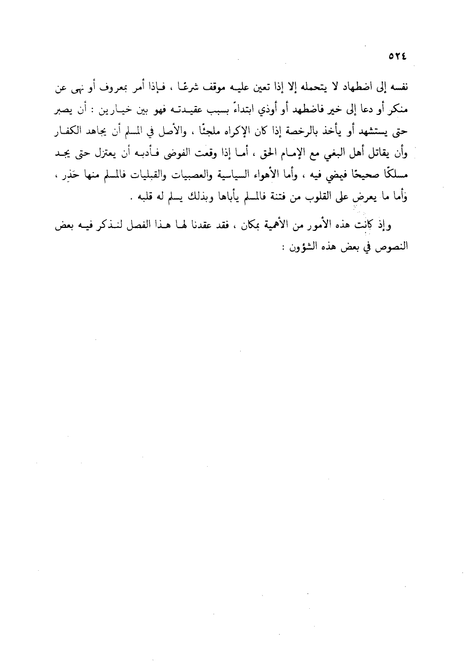 نفسه إلى اضطهاد لا يتحمله إلا إذا تعين عليه موقف شرعاً، فإذا أمر بمعروف أو نهي عن منكر أو دعا إلى خير فاضطهد أو أوذي ابتداءً بسبب عقيدته فهو بين خيارين: أن يصبر حتى يستشهد أو يأخذ بالرخصة إذا كان الإكراه ملجئاً، والأصل في المسلم أن يجاهد الكفار وأن يقاتل أهل البغي مع الإمام الحق، أما إذا وقعت الفوضى فأدبه أن يعتزل حتى يجد مسلكاً صحيحاً فيمضي فيه، وأما الأهواء السياسية والعصبيات والقبليات فالمسلم منها حَذِر، وأمام ما يعرض على القلوب من فتنة فالمسلم يأباها وبذلك يسلم له قلبه.