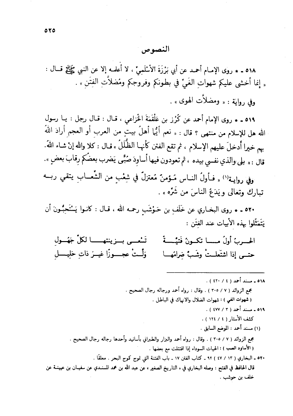 519 - * روى الإمام أحمد عن كرز بن علقمة الخزاعي، قال: قال رجل: يا رسول الله هل للإسلام من منتهى؟ قال: "نعم أيما أهل بيتٍ من العرب أو العجم أراد الله بهم خيراً أدخل عليهم الإسلام، ثم تقع الفتن كأنها الظلل" قال: كلا والله إن شاء الله. قال: "بلى والذي نفسي بيده، ثم تعودون فيها أساود صُبى يضرب بعضكم رقاب بعض".