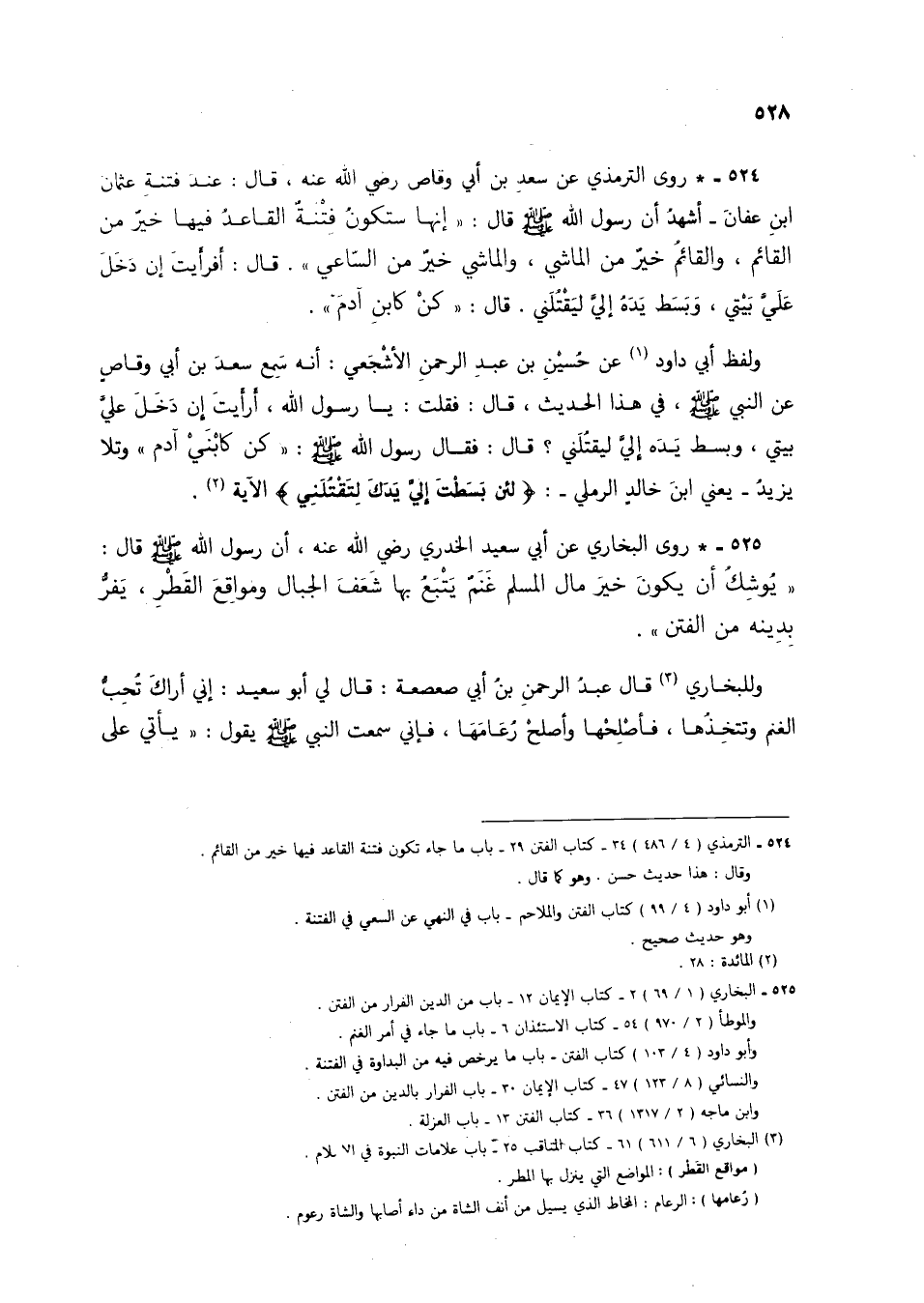 524 - * روى الترمذي عن سعد بن أبي قاص رضي الله عنه، قال: عند فتنة عثمان بن عفان- أشهد أن رسول الله صلى الله عليه وسلم قال: "إنها ستكون فتنة القاعدُ فيها خيرٌ من القائم، والقائمُ خيرٌ من الماشي، والماشي خيرٌ من الساعي". قال: أفرأيت إن دخل عليَّ بيتي، وبسط يده إلي ليقتلني. قال: "كن كابن آدم".