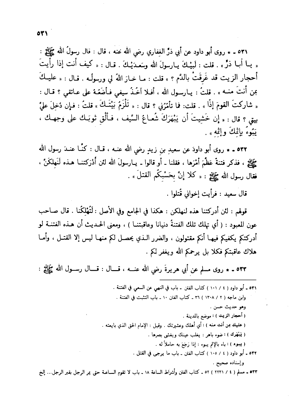 531 - * روى أبو داود عن أبي ذرٍّ الغفاري رضي الله عنه، قال: قال رسول الله صلى الله عليه وسلم: "يا أبا ذرٍّ. قلت: لبيك يا رسول الله وسعديك. قال: "كيف أنت إذا رأيت أحجار الزيت قد غرقت بالدم؟ " قلت: ما خار الله لي ورسوله. قال: "عليك بمن أنت منه". قلت: يا رسول الله، أفلا آخُذُ سيفي فأضعه على عاتقي؟ قال: "شاركت القوم إذاً. قلت: فما تأمرني؟ قال: تلزمُ بيتك" قلت: فإن دُخل عليَّ بيتي؟ قال: "إن خشيت أن يبهرك شعاعُ السيف، فألق ثوبك على وجهك، يبوء بإثمك وإثمه".