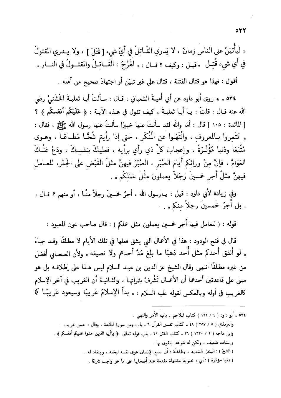 534 - * روى أبو داود عن أبي أمية الشعباني، قال: سألتُ أبا ثعلبة الخُشني رضي الله عنه قال: قلت: يا أبا ثعلبة، كيف تقول في هذه الآية: {عَلَيْكُمْ أَنْفُسَكُمْ}؟ [المائدة: 105] قال: أما والله لقد سألت عنها خبيراً سألتُ عنها رسول الله صلى الله لعليه وسلم، فقال: "ائتمروا بالمعروف، وانتهوا عن المنكر، حتى إذا رأيتم شُحاً مطاعاً، وهوى متبعاً ودنيا مؤثرة، وإعجاب كل ذي رأي برأيه، فعليك بنفسك، ودع عنك العوام، فإن من ورائكم أيام الصبرِ، الصبرُ فيهن مثلُ القبض على الجمر، للعامل فيهن مثل أجر خمسين رجلاً يعملون مثل عملكم".