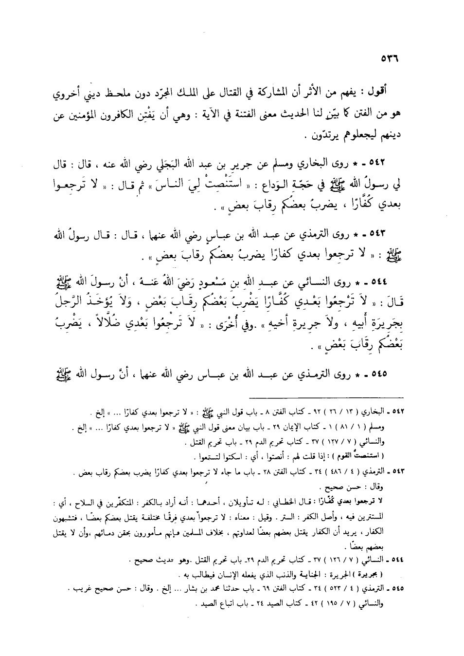 544 - * روى النسائي عن عبد الله بن مسعودٍ رضي الله عنه، أن رسول الله صلى الله عليه وسلم قال: "لا ترجعوا بعدي كفاراً يضربُ بعضكم رقاب بعضٍ، ولا يؤخذ الرجل بجريرة أبيه، ولا جريرة أخيه". وفي أخرى: "لا ترجعوا بعدي ضُلالاً، يضربُ بعضكم رقاب بعضٍ".