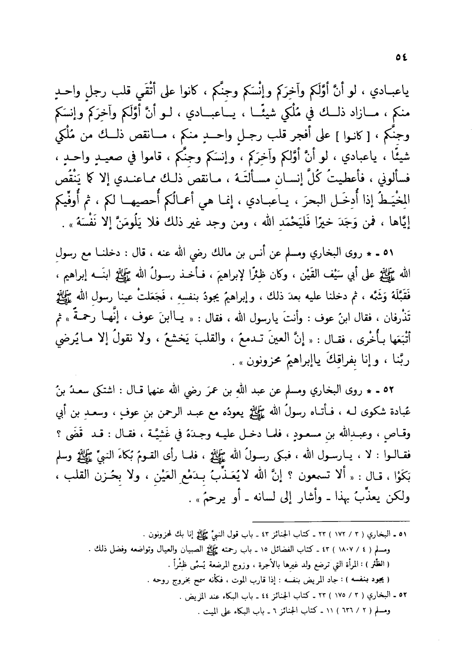 51 - * روى البخاري ومسلم عن أنس بن مالك رضي الله عنه، قال: دخلنا مع رسول الله صلى عليه وسلم على أبي سيف القين، وكان ظئراً لإبراهيم، فأخذ رسول الله صلى الله عليه وسلم ابنه إبراهيم، فقلبه وشمه، ثم دخلنا عليه بعد ذلك، وإبراهيم يجود بنفسه، فجعلت عيناً رسول الله صلى الله عليه وسلم تذرفان، فقال ابن عوف: وأنت يا رسول الله، فقال: "يا ابن عوف، إنها رحمةٌ" ثم أتبعها بأخرى، فقال: "إن العين تدمع، والقلب يخشع، ولا تقول إلا ما يرضي ربنا، وإنا بفراقك يا إبراهيم محزونون".