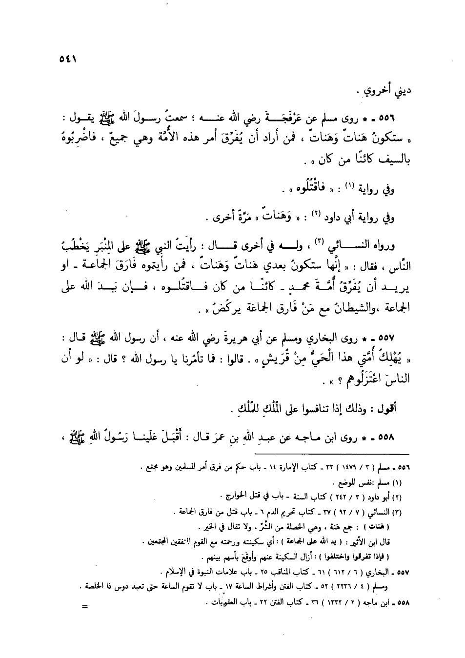 556 - * روى مسلم عن عرفجة رضي الله عنه؛ سمعتُ رسول الله صلى الله عليه وسلم يقول: "ستكون هَناتٌ وَهَناتٌ، فمن أراد أن يُفرق أمر هذه الأمة وهي جميعٌ، فاضربوه بالسيف كائناً من كان".