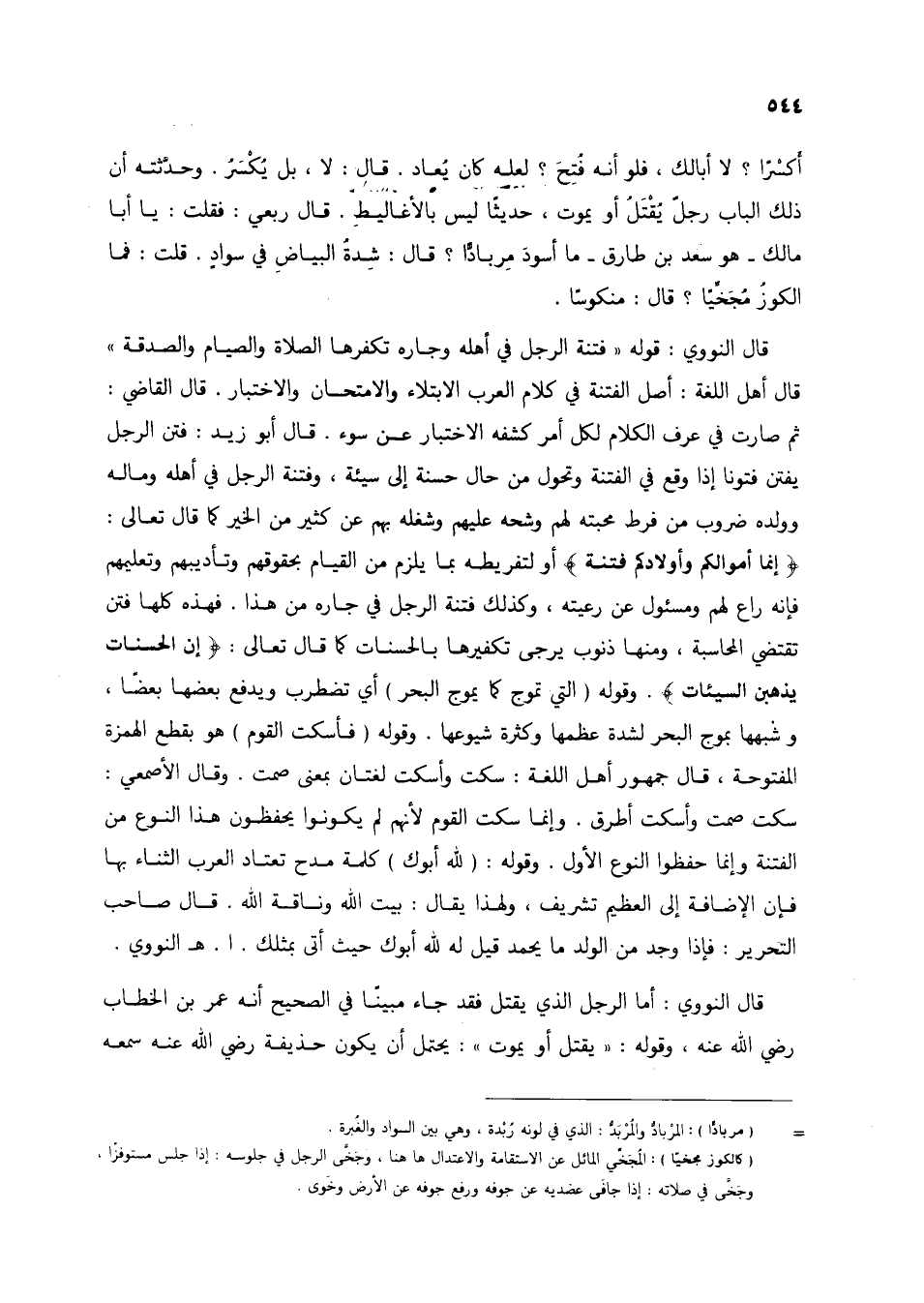 قال النووي: قوله "فتنة الرجل في أهله وجاره تكفرها الصلاة والصيام والصدقة" قال أهل اللغة: أصل الفتنة في كلام العرب الابتلاء والامتحان والاختبار. قال القاضي: ثم صارت في عرف الكلام لكل أمر كشفه الاختبار عن سوء. قال أبو زيد: فتن الرجل يفتن فتونا إذا وقع في الفتنة وتحول من حال حسنة إلى سيئة، وفتنة الرجل في أهله وماله وولده ضروب من فرط محبته لهم وشحه عليهم وشغله بهم عن كثير من الخير كما قال تعالى: {أَنَّمَا أَمْوَالُكُمْ وَأَوْلَادُكُمْ فِتْنَةٌ} أو لتفريطه بما يلزم من القيام بحقوقهم وتأديبهم وتعليمهم فإنه راع لهم ومسئول عن رعيته، وكذلك فتنة الرجل في جاره من هذا. فهذه كلها فتن تقتضي المحاسبة، ومنها ذنوب يرجى تكفيرها بالحسنات كما قال تعالى: {إِنَّ الْحَسَنَاتِ يُذْهِبْنَ السَّيِّئَاتِ}. وقوله (التي تموج كما يموج البحر) أي تضطرب ويدفع بعضها بعضاً، وشبهها بموج البحر لشدة عظمها وكثرة شيوعها. وقوله (فأسكت القوم) هو بقطع الهمزة المفتوحة، قال جمهور أهل اللغة: سكت وأسكت لغتان بمعنى صمت. وقال الأصمعي: سكت صمت وأسكت أطرق. وإنما سكت القوم لأنهمن لم يكونوا يحفظون هذا النوع من الفتنة وإنما حفظوا النوع الأول. وقوله: (لله أبوك) كلمة مدح تعتاد العرب الثناء بها فإن الإضافة إلى العظيم تشريف، ولهذا يقال: بيت الله وناقة الله. قال صاحب التحرير: فإذا وجد من الولد ما يحمد قيل له لله أبوك حيث أتى بمثلك أ. هـ النووي.