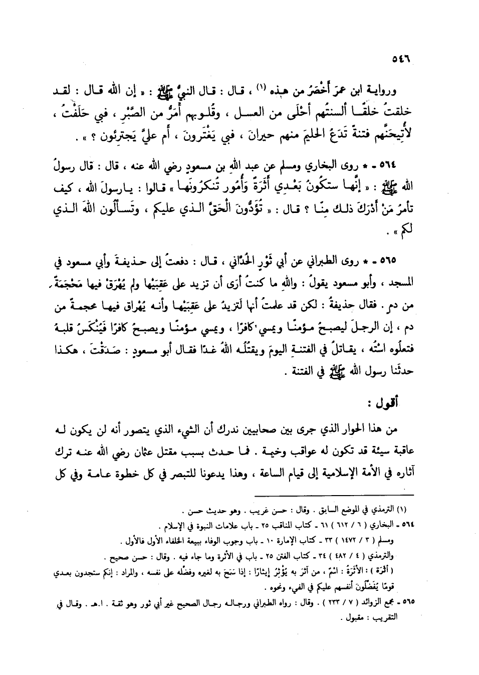 565 - * روى الطبراني عن أبي ثور الحُداني، قال: دفعتُ إلى حذيفة وأبي مسعود في المسجد، وأبو مسعود يقول: والله ما كنتُ أرى أن تزيد على عقبيها ولم يُهرق فيها محجمةً من دم. فقال حذيفةُ: لكن قد علمتُ أنها لتزيدُ على عقبيها وأنه يُهراق فيها محجمةٌ من دم، إن الرجل ليصبح مؤمناً ويمسي كافراً، ويمسي مؤمناً ويصبح كافراً فينُكسُ قلبه فتعلوه استه، يقاتل في الفتنة اليوم ويقتله الله غداً فقال أبو مسعودٍ: صدقت، هكذا حدثنا رسول الله صلى الله عليه وسلم في الفتنة.