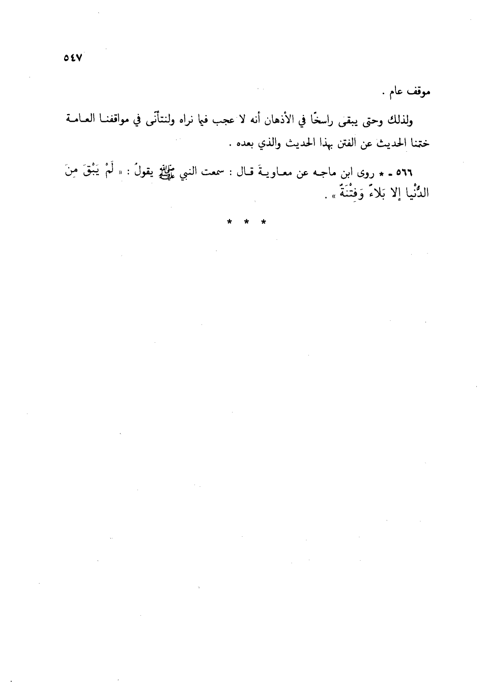566 - * روى ابن ماجه عن معاوية قال: سمعت النبي صلى الله عليه وسلم يقول: "لم يبق من الدنيا إلا بلاءٌ وفتنةٌ".