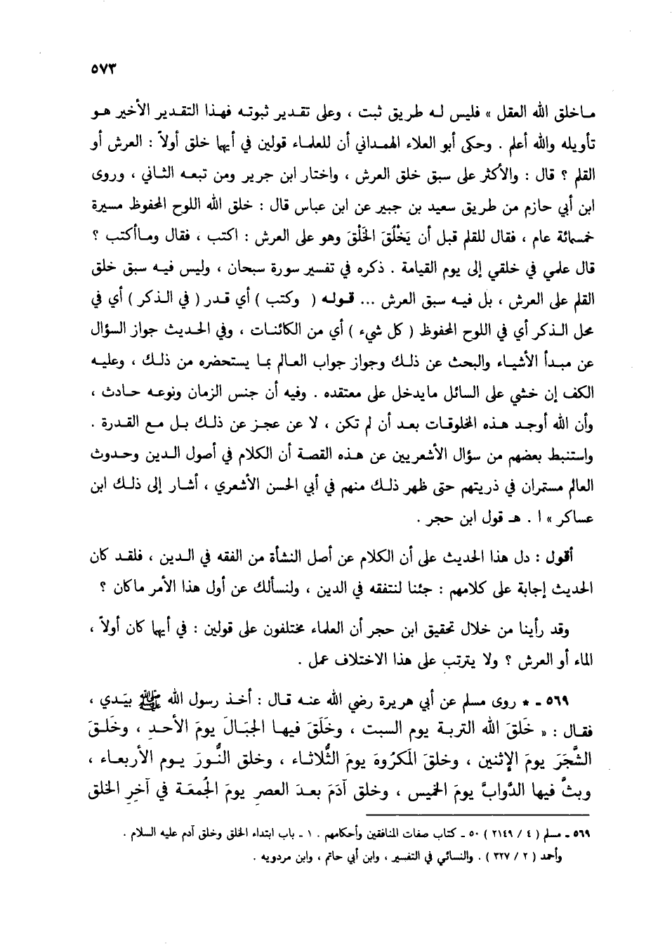 ما خلق الله العقل" فليس له طريق ثبت، وعلى تقدير ثبوته فهذا التقدير الأخير هو تأويله والله أعلم. وحكى أبو العلاء الهمداني أن للعلماء قولين في أيهما خلق أولاً: العرش أو القلم؟ قال: والأكثر على سبق خلق العرش، واختار ابن جرير ومن تبعه الثاني، وروى ابن أبي حازم من طريق سعيد بن جبير عن ابن عباس قال: خلق الله اللوح المحفوظ مسيرة خمسمائة عام، فقال للقلم قبل أن يَخْلُقَ الخَلْقَ وهو على العرش: اكتب، فقال وما أكتب؟ قال علمي في خلقي إلى يوم القيامة. ذكره في تفسير سورة سبحان، وليس فيه سبق خلق القلم على العرش، بل فيه سبق العرش ... قوله (وكتب) أي قدر (في الذكر) أي في محل الذكر أي في اللوح المحفوظ (كل شيء) أي من الكائنات، وفي الحديث جواز السؤال عن مبدأ الأشياء والبحث عن ذلك وجواز عن ذلك وجواز جواب العالم بما يستحضره من ذلك، وعليه الكف إن خشي على السائل ما يدخل على معتقده. وفيه أن جنس الزمان ونوعه حادث، وأن الله أوجد هذه المخلوقات بعد أن لم تكن، لا عن عجز عن ذلك بل مع القدرة. واستنبط بعضهم من سؤال الأشعريين عن هذه القصة أن الكلام في أصول الدين وحدوث العالم مستمران في ذريتهم حتى ظهر ذلك منهم في أبي الحسن الأشعري، أشار إلى ذلك ابن عساكر" ا. هـ قول ابن حجر.