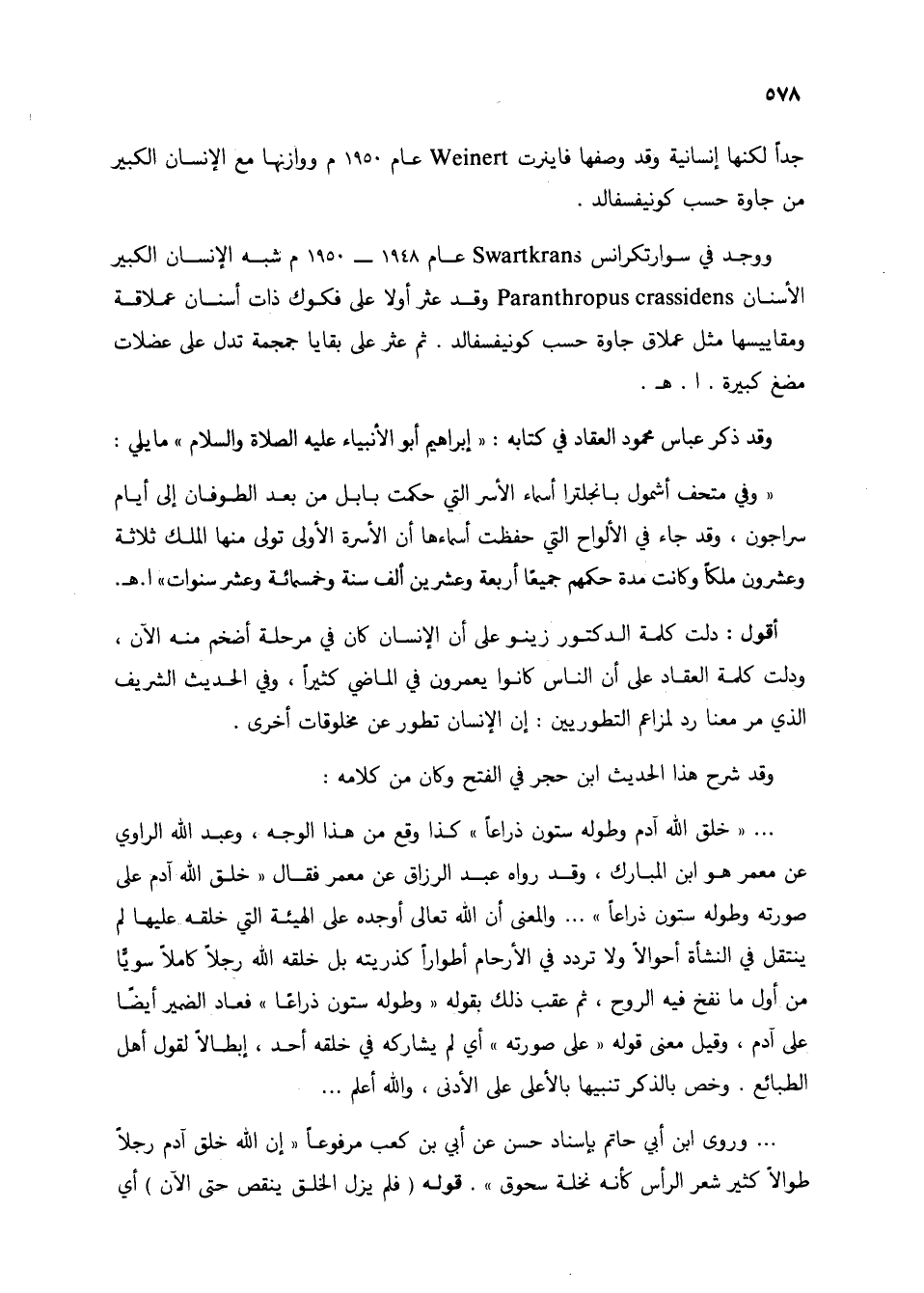 أقول: دلت كلمة الدكتور زينو على أن الإنسان كان في مرحلة أضخم منه الآن، ودلت كلمة العقاد على أن الناس كانوا يعمرون في الماضي كثيراً، وفي الحديث الشريف الذي مر معنا رد لمزاعم التطوريين: إن الإنسان تطور عن مخلوقات أخرى.