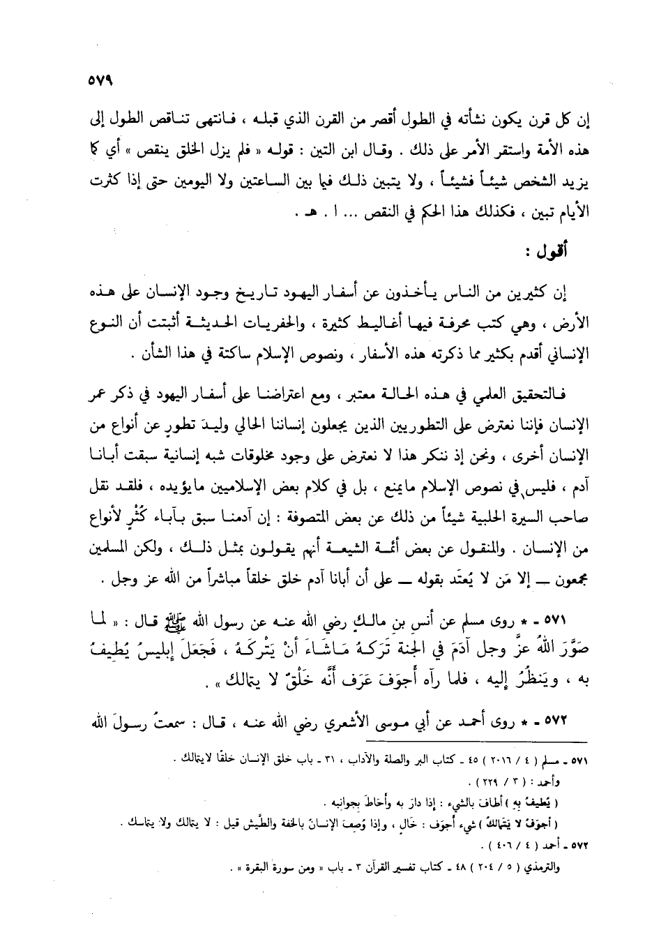 فالتحقيق العلمي في هذه الحالة معتبر، ومع اعتراضنا على أسفار اليهود في ذكر عُمر الإنسان فإننا نعترض على التطوريين الذين يجعلون إنساننا الحالي وليدَ تطورٍ عن أنواع من الإنسان أخرى، ونحن إذ ننكر هذا لا نعترض على وجود مخلوقات شبه إنسانية سبقت أبانا آدم، فليس في نصوص الإسلام ما يمنع، بل في كلام بعض الإسلاميين ما يؤيده، فلقد نقل صاحب السيرة الحلبية شيئاً من ذلك عن بعض المتصوفة: إن آدمنا سبق بآباء كُثْرٍ لأنواع من الإنسان. والمنقول عن بعض أئمة الشيعة أنهم يقولون بمثل ذلك، ولكن المسلمين مجمعون- إلا من لا يُعتد بقوله- على أن أبانا آدم خلق خلقاً مباشراً من الله عز وجل.