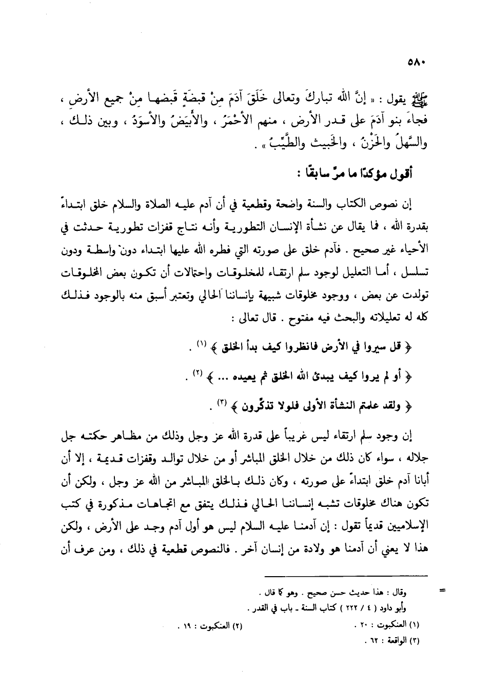 إن نصوص الكتاب والسنة واضحة وقطعية في أن آدم عليه الصلاة والسلام خلق ابتداءً بقدرة الله، فما يقال عن نشأة الإنسان التطورية وأنه نتاج قفزات تطورية حدثت في الأحياء غير صحيح. فآدم خلق على صورته التي فطره الله عليها ابتداء دون واسطة ودون تسلسل، أما التعليل لوجود سلم ارتقاء للمخلوقات واحتمالات أن تكون بعض المخلوقات تولدت عن بعض، ووجود مخلوقات شبيهة بإنساننا الحالي وتعتبر أسبق منه بالوجود فذلك كله له تعليلاته والبحث فيه مفتوح. قال تعالى: