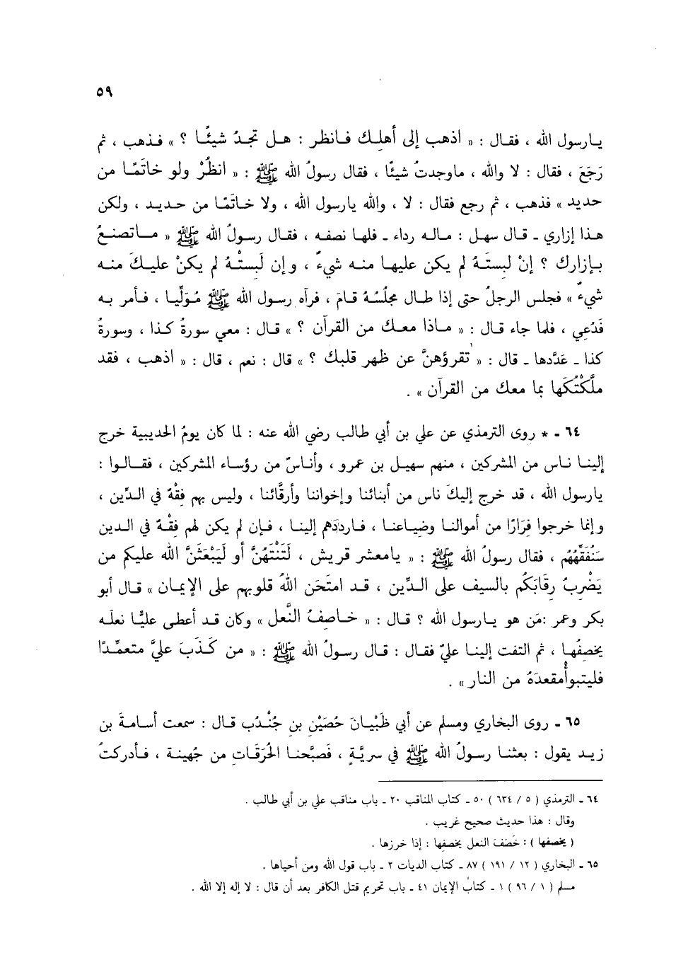 64 - * روى الترمذي عن علي بن أبي طالب رضي الله عنه: لما كان يوم الحديبية خرج إلينا ناس من المشركين، منهم سهيل بن عمرو، وأناس من رؤساء المشركين، فقالوا: يا رسول الله، قد خرج إليك ناس من أبنائنا وإخواننا وأرقائنا، وليس بهم فقه في الدين، وإنما خرجوا فراراً من أموالنا وضياعنا، فارددهم إلينا، فإن لم يكن لهم فقه في الدين، وإنما خرجوا فراراً من أموالنا وضياعنا، فارددهم إلينا، فإن لم يكن لهم فقةً في الدين سنفقههم، فقال رسول الله صلى الله عليه وسلم: "يا معشر قريش، لتنتهن أو ليبعثن الله عليكم من يضرب رقابكم بالسيف على الدين، قد امتحن الله قلوبهم على الإيمان" قال أبو بكر وعمر: من هو يا رسول الله؟ قال: "خاصف النعل" وكان قد أعطى عليا نعله يخصفها، ثم التفت إلينا علي فقال: قال رسول الله صلى الله عليه وسلم: "من كذب علي متعمداً فليتبوأ من النار".