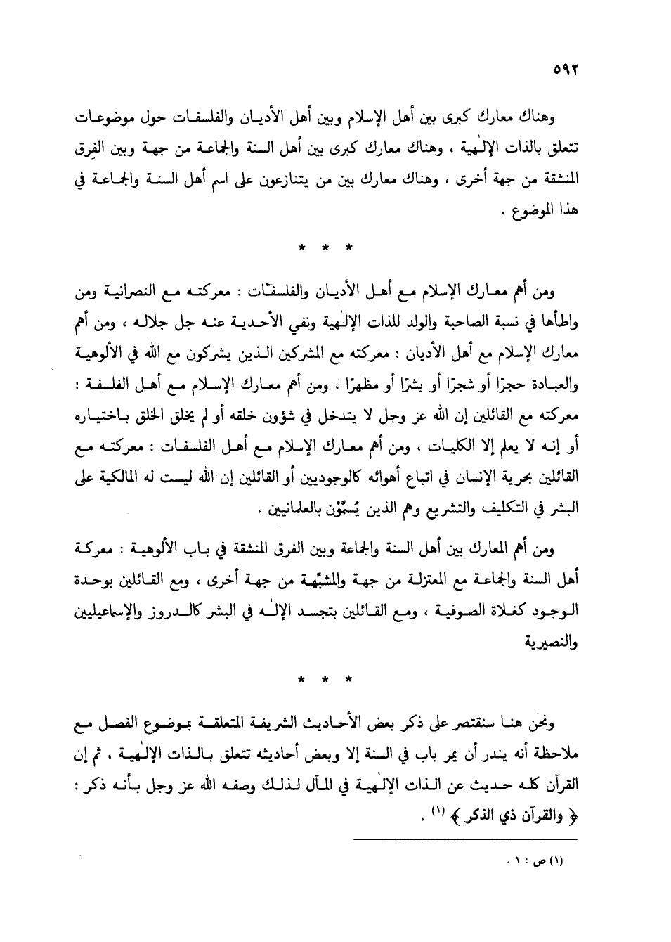 وهناك معارك كبرى بين أهل الإسلام وبين أهل الأديان والفلسفات حول موضوعات تتعلق بالذات الإلهية، وهناك معارك كبرى بين أهل السنة والجماعة من جهة وبين الفرق المنشفة من جهة أخرى، وهناك معارك بين من يتنازعون على اسم أهل السنة والجماعة في هذا الموضوع.