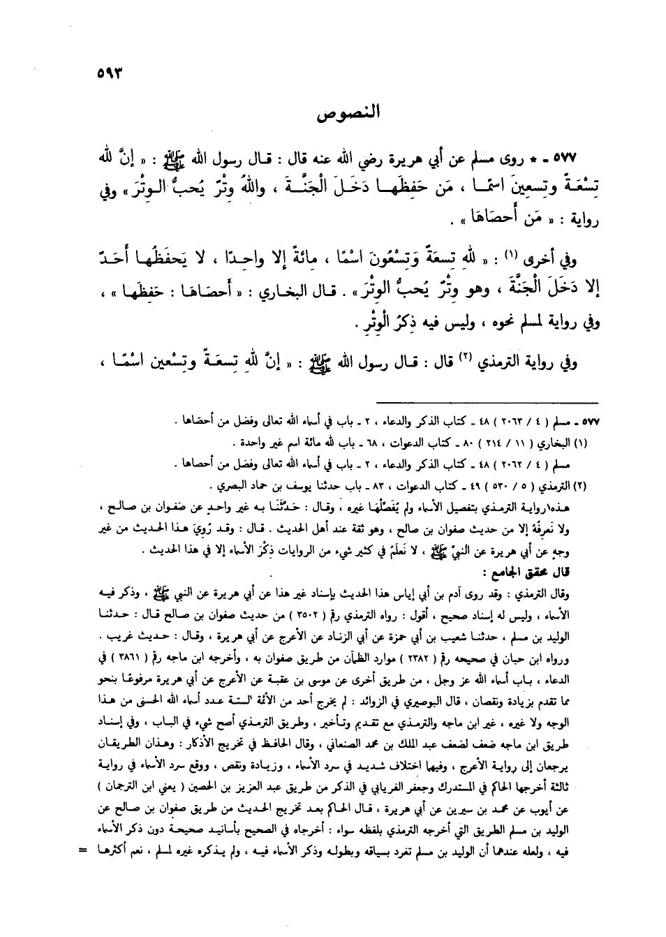 577 - * روى مسلم عن أبي هريرة رضي الله عنه قال: قال رسول الله صلى الله عليه وسلم: "إنَّ لله تسعةٌ وتسعين اسماً، من حفظها دخل الجنة، والله وِتْرٌ يحب الوتر" وفي رواية: "من أحصاها".