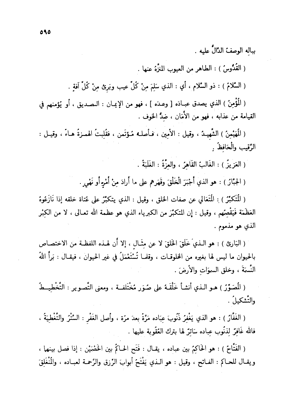 (المهيمن) الشهيد، وقيل: الأمين، فأصله مؤتمن، فقُلِبت الهمزة هاءً، وقيل: الرقيب والحافظ.