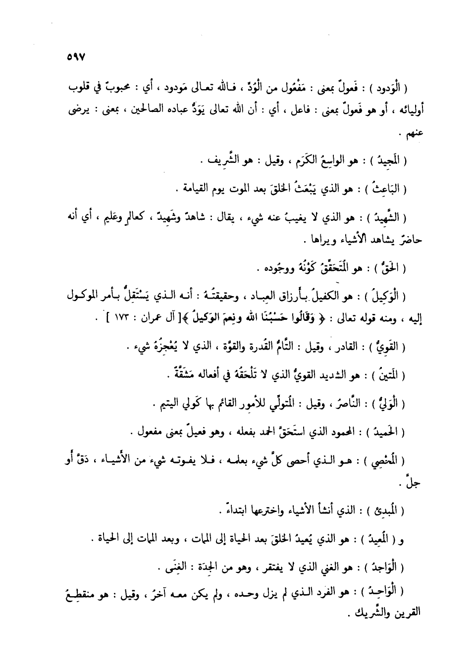 (الودود): فعول بمعنى: مفعول من الود، فالله تعالى مودود، أي: محبوب في قلوب أوليائه، أو هو فعول بمعنى: فاعل، أي: أن الله تعالى يود عباده الصالحين، بمعنى: يرضى عنهم.
