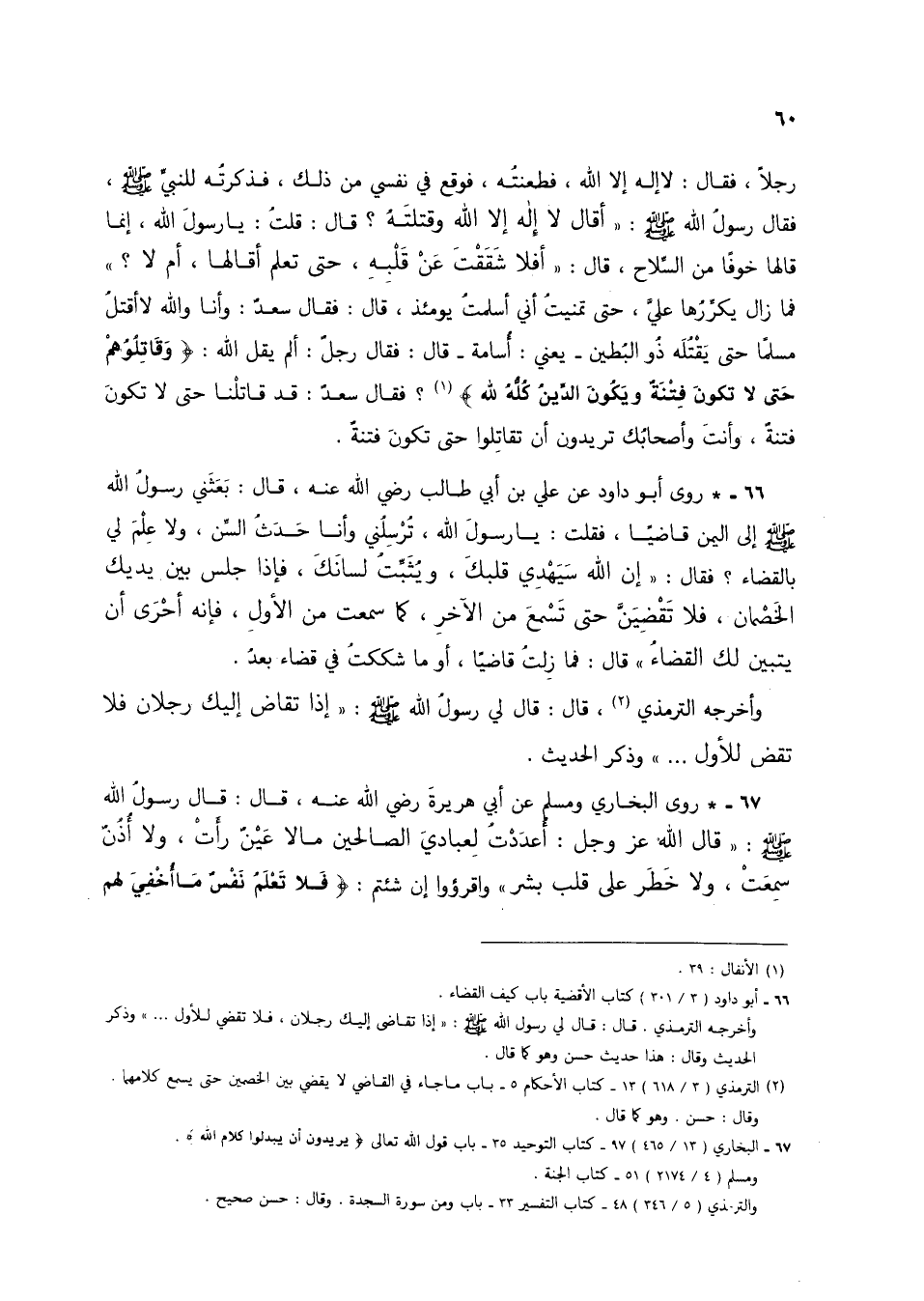 66 - * روى أبو داود عن علي أبي طالب رضي الله عنه، قال: بعثني رسول الله صلى الله عليه وسلم إلى اليمن قاضياً، فقلت: يا رسول الله، ترسلني وأنا حدث السن، ولا علم لي بالقضاء؟ فقال: "إن الله سيهدي قلبك، ويثبت لسانك، فإذا جلس بين يديك الخصمان، فلا تقضين حتى تسمع من الآخر، كما سمعت من الأول، فإنه أحرى أن يتبين لك القضاء" قال: فما زلت قاضياً، أو ما شككت في قضاء بعد.