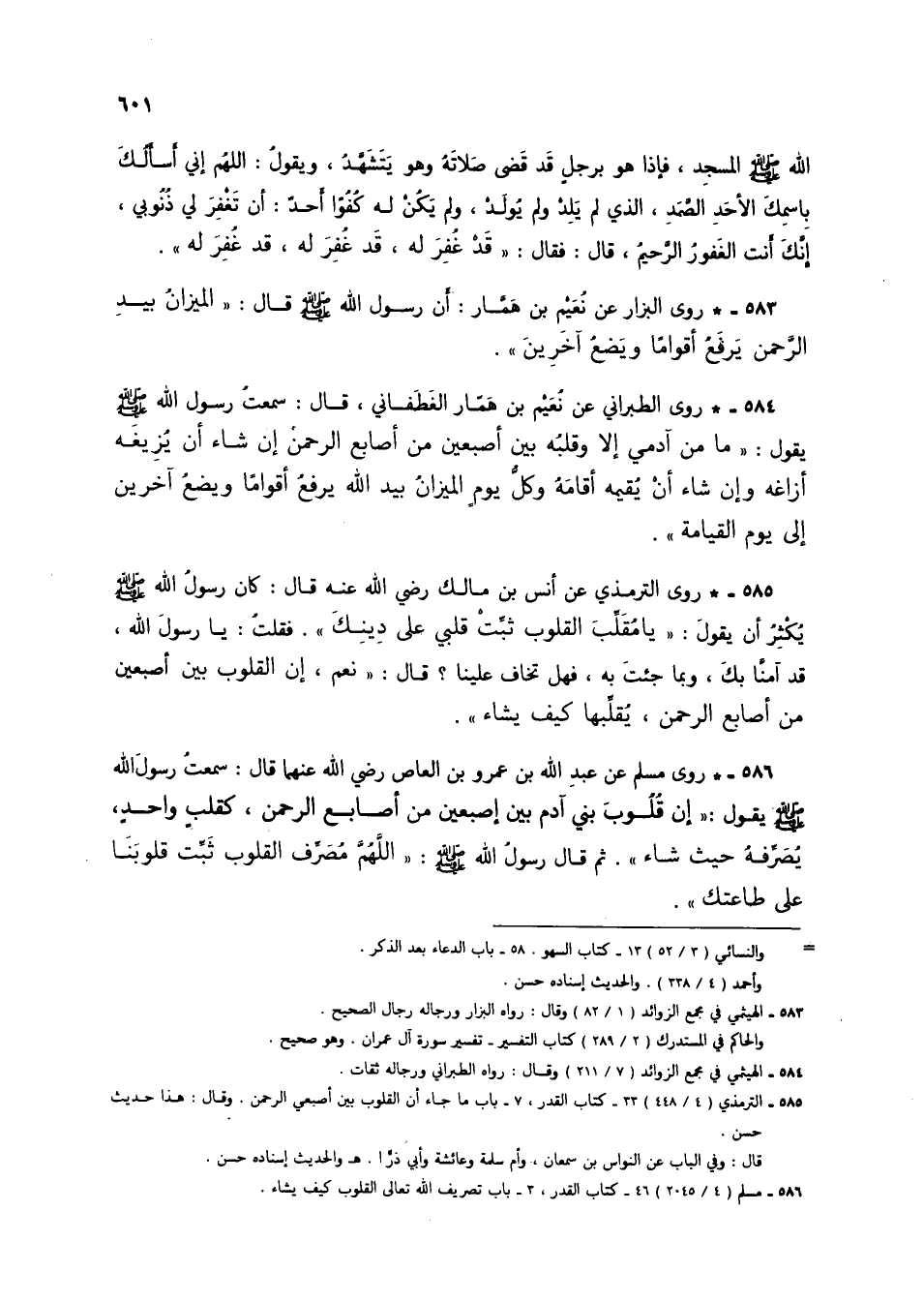584 - * روى الطبراني عن نعيم بن همار الغطفاني، قال: سمعت رسول الله صلى الله عليه وسلم يقول: "ما من آدمي إلا وقلبه بين أصبعين من أصابع الرحمن إن شاء أن يزيغه أزاغه وإن شاء أن يقيمه أقامه وكل يومٍ الميزان بيد الله يرفعُ أقواماً ويضغ آخرين إلى يوم القيامة".