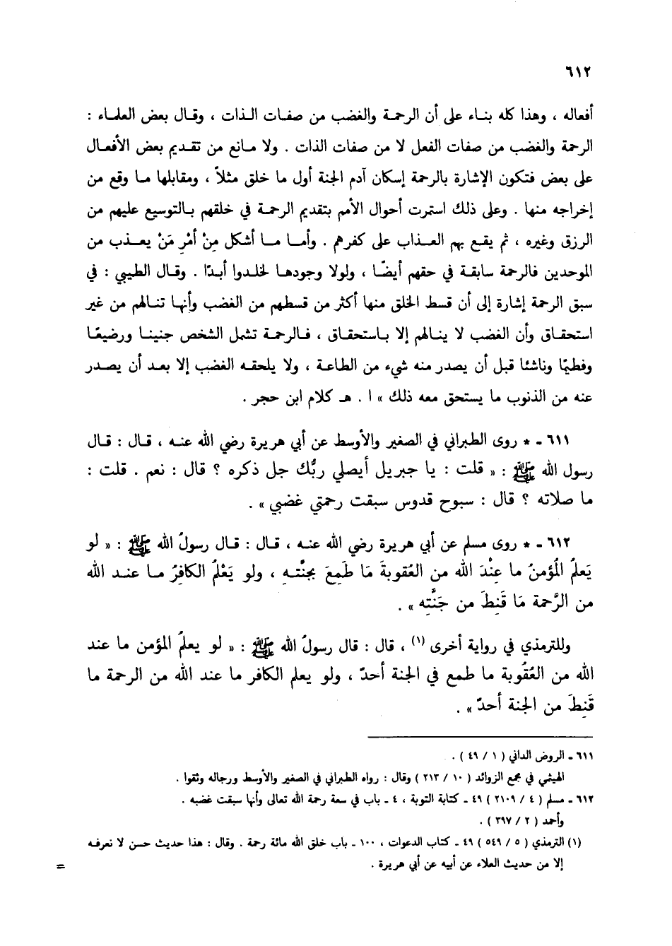 611 - * روى الطبراني في الصغير والأوسط عن أبي هريرة رضي الله عنه، قال: قال رسول الله صلى الله عليه وسلم: "قلت: يا جبريل أيصلي ربك جل ذكره؟ قال: نعم. قلت: ما صلاته؟ قال: سبوح قدوس سبقت رحمتي غضبي".