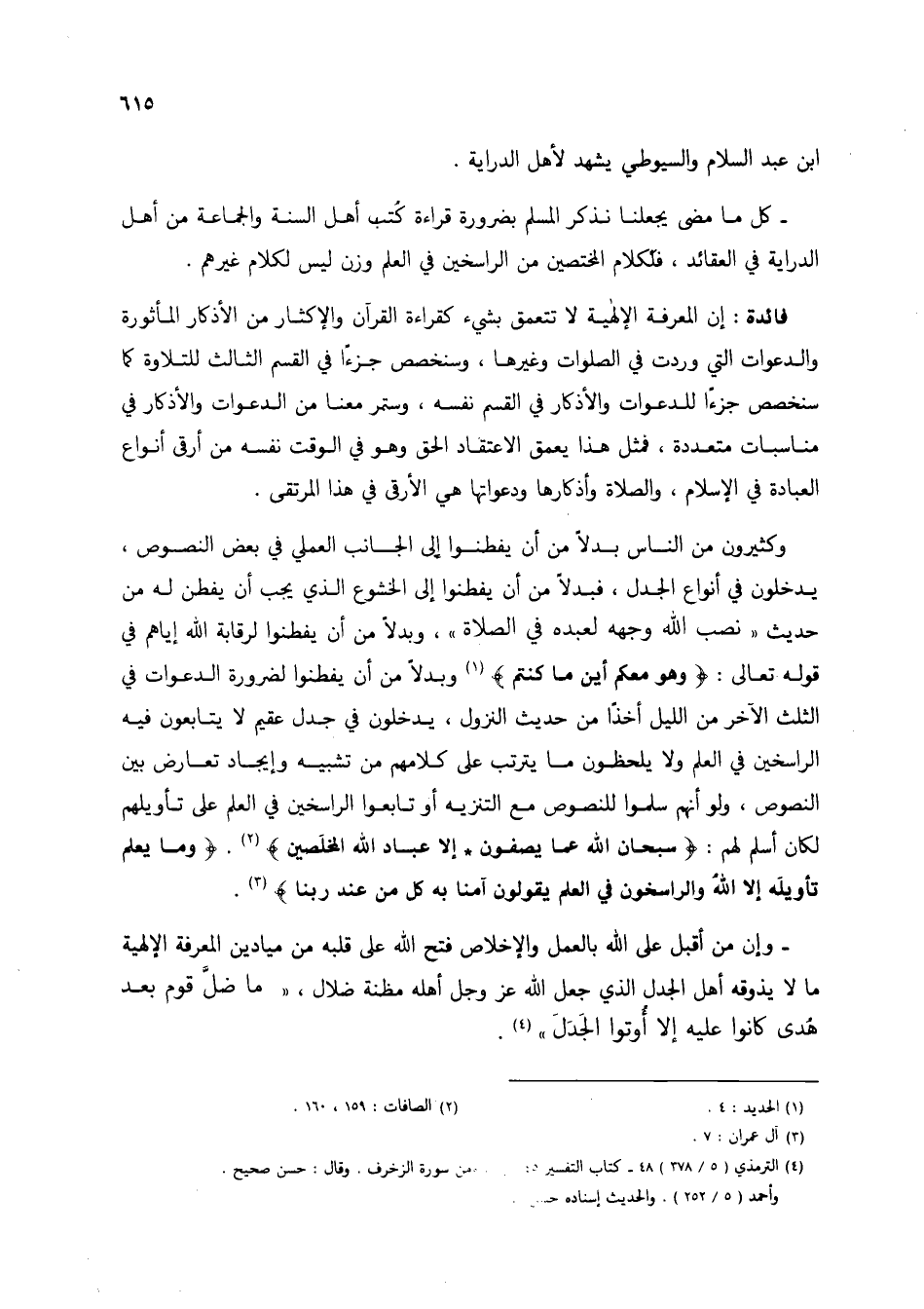 - وإن من أقبل على الله بالعمل والإخلاص فتح الله على قلبه من ميادين المعرفة الإلهية ما لا يذوقه أهل الجدل الذي جعل الله عز وجل أهله مظنة ضلال، "ما ضلَّ قوم بعد هدى كانوا عليه إلا أوتوا الجدل" (4).