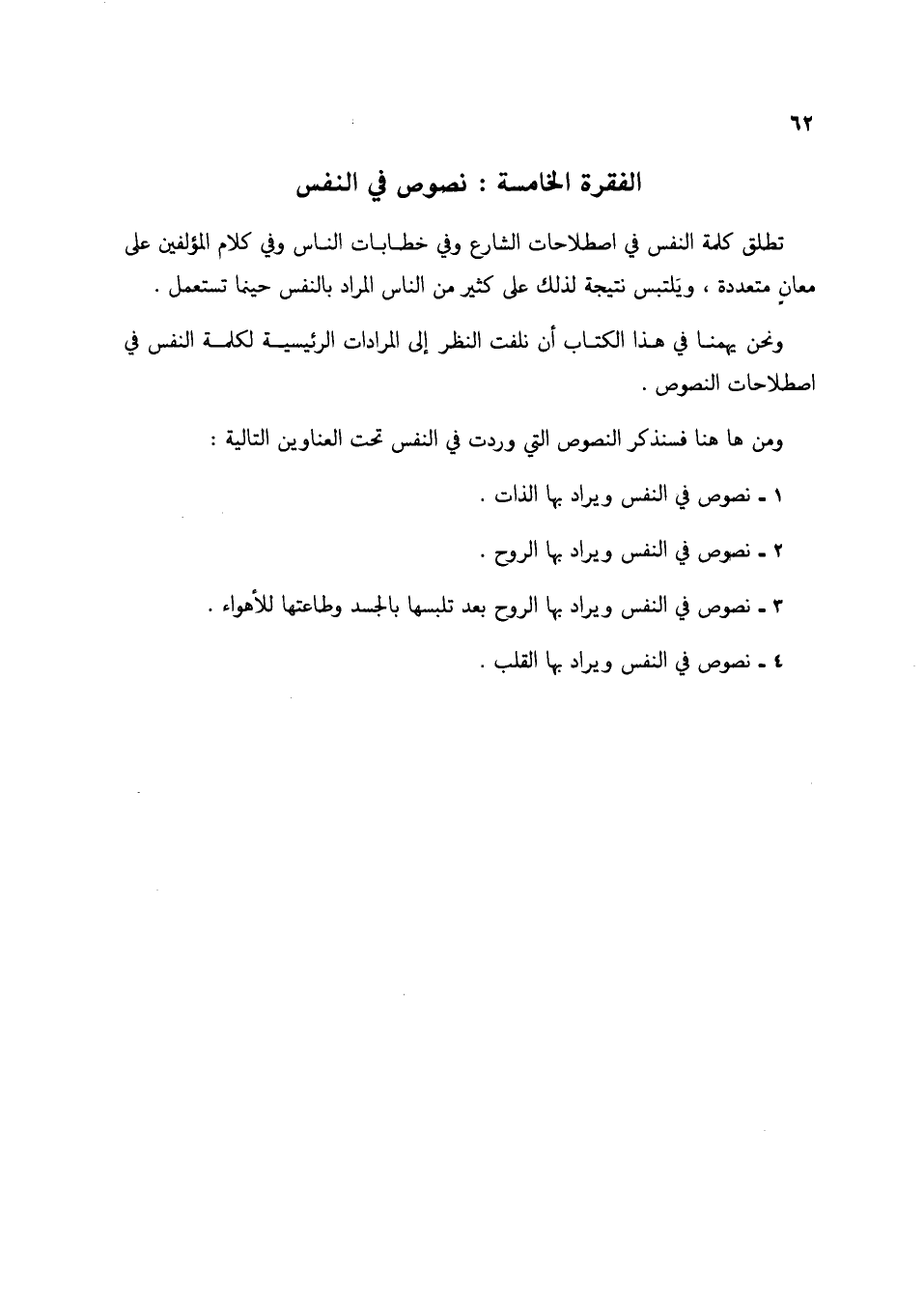 ونحن يهمنا في هذا الكتاب أن نلفت النظر إلى المرادات الرئيسية لكلمة النفس في اصطلاحات النصوص.