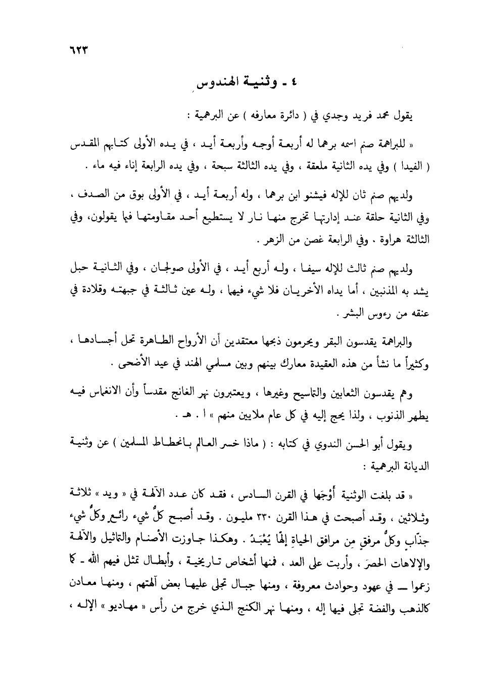 ويقول أبو الحسن الندوي في كتابه: (ماذا خسر العالم بانحطاط المسلمين) عن وثنية الديانة البرهمية: