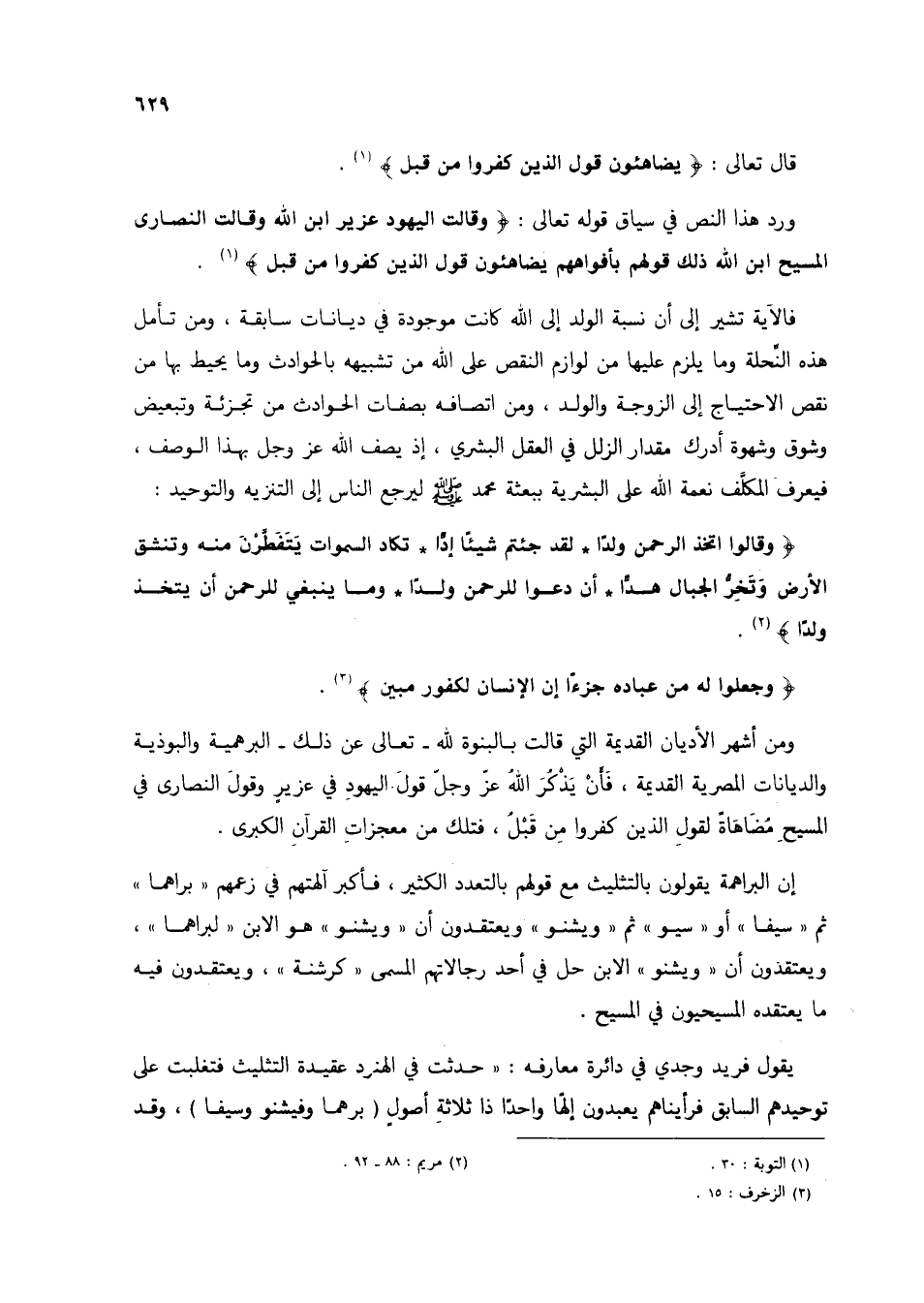 ومن أشهر الأديان القديمة التي قالت بالبنوة لله- تعالى عن ذلك- البراهية والبوذية والديانات المصرية القديمة، فأن يذكُر الله عز وجل قول اليهود في عزيرٍ وقول النصارى في المسيح مضاهاة لقول الذين كفروا من قبلُ، فتلك من معجزات القرآن الكبرى.