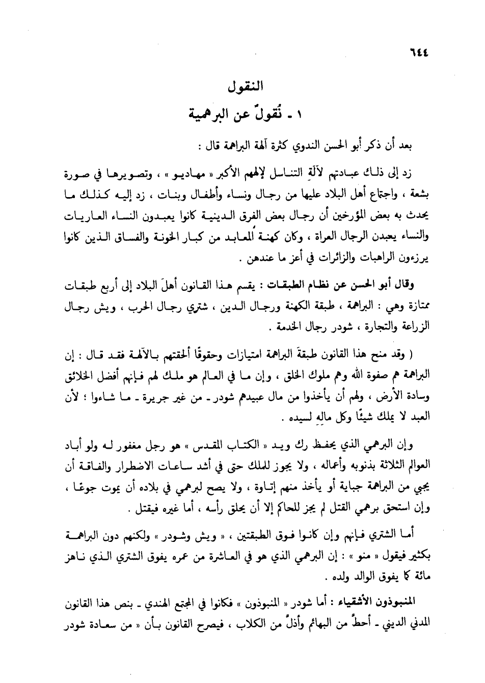 بعد أن ذكر أبو الحسن الندوي كثرة آلهة البراهمة قال: