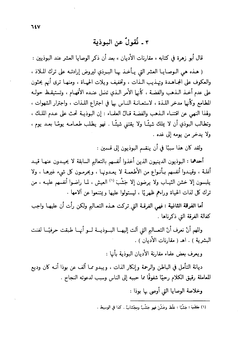 أحدهما: البوذيون الدينيون الذين أخذوا انفسهم بالتعاليم السابقة لا يحيدون عنها قيد أنملة، وقيدوا أنفسهم بأنواع من الأطعمة لا يعدونها، ويحرمون كل شيء غيرها، ولا يلبسون إلا خشن الثياب ولا يرضون إلا جَشْبَ (1) العيش، لما راضوا أنفسهم عليه، من ترك كل لذات الحياة وراءهم ظهرياً، ليستولوا عليها ويمتنعوا عن آلامها.