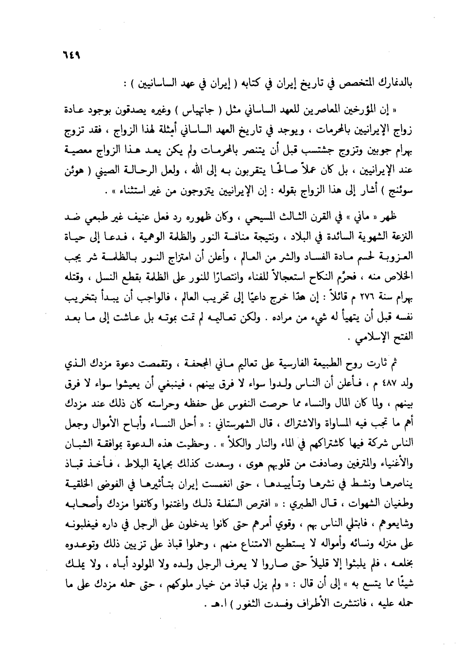 "إن المؤرخين المعاصرين للعهد الساساني مثل (جاتهياس) وغيره يصدقون بوجود عادة زواج الإيرانيين بالمحرمات، ويوجد في تاريخ العهد الساساني أمثلة لهذا الزواج، فقد تزوج بهرام جوبين وتزوج جشتسب قبل أن يتنصر بالمحرمات ولم يكن يعد هذا الزواج معصية عند الإيرانيين، بل كان عملاً صالحاً يتقربون به إلى الله، ولعل الرحالة الصيني (هوئن سوئنج) أشار إلى هذا الزواج بقوله: إن الإيرانيين يتزوجون من غير استثناء".