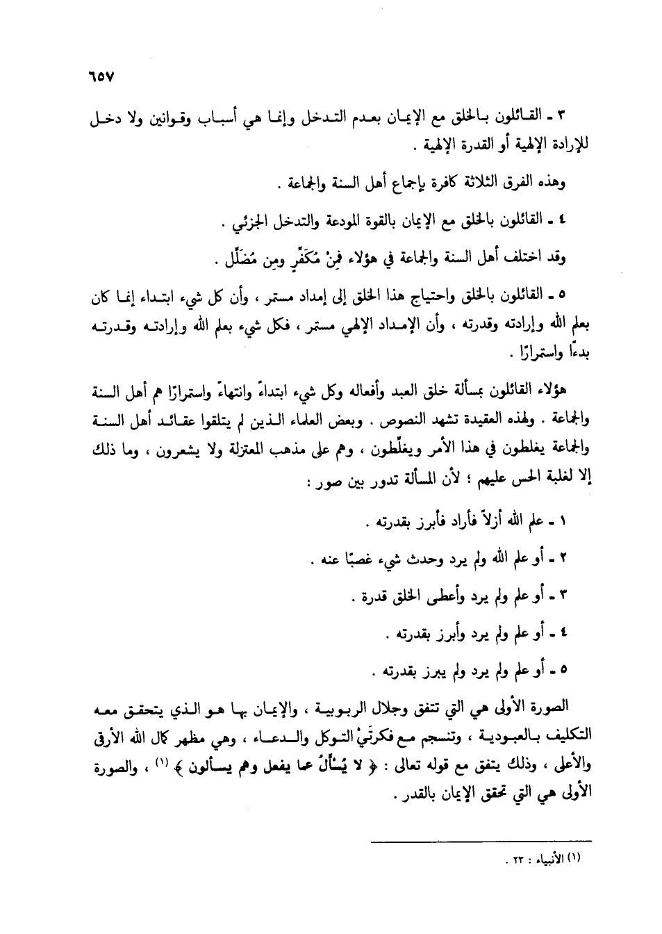هؤلاء القائلون بمسألة خلق العبد وأفعاله وكل شيء ابتداءً وانتهاءً واستمراراً هم أهل السنة والجماعة. ولهذه العقيدة تشهد النصوص. وبعض العلماء الذين لم يتلقوا عقائد أهل السنة والجماعة يغلطون في هذا الأمر ويغلِّطون، وهم على مذهب المعتزلة ولا يشعرون، وما ذلك إلا لغلبة الحس عليهم؛ لأن المسألة تدور بين صور: