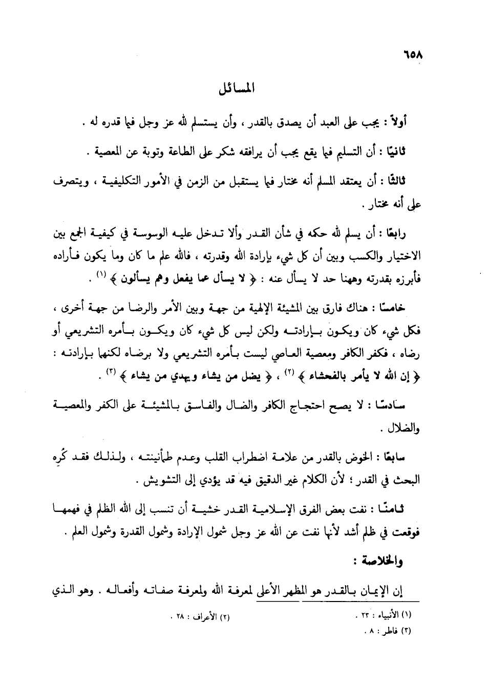 إن الإيمان بالقدر هو المظهر الأعلى لمعرفة الله ولعرفة صفاته وأفعاله. وهو الذي