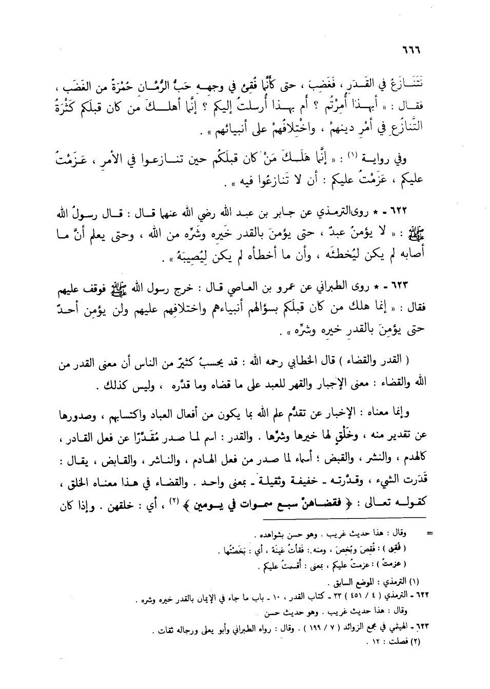 623 - * روى الطبراني عن عمروبن العاصي قال: خرج رسول الله صلى الله عليه وسلم فوقف عليهم فقال: "إنما هلك من كان قبلكم بسؤالهم أنبياءهم واختلافهم عليهم ولن يؤمن أحدٌ حق يؤمن بالقدر خيره وشره".