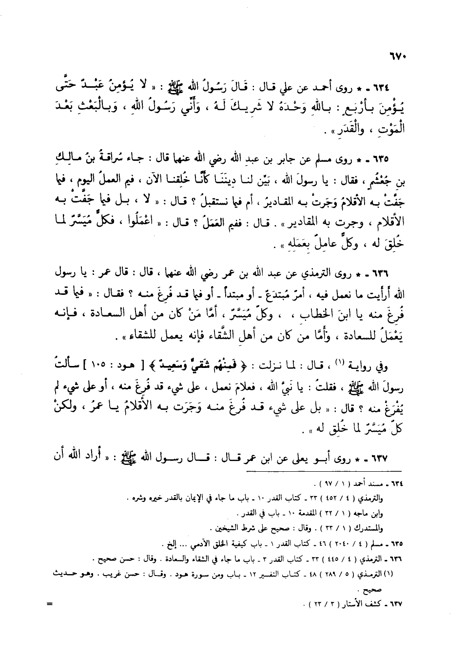 والترمذي (4/ 452) 33 - كتاب القدر 10 - باب ما جاء في الإيمان بالقدر خيره وشره.