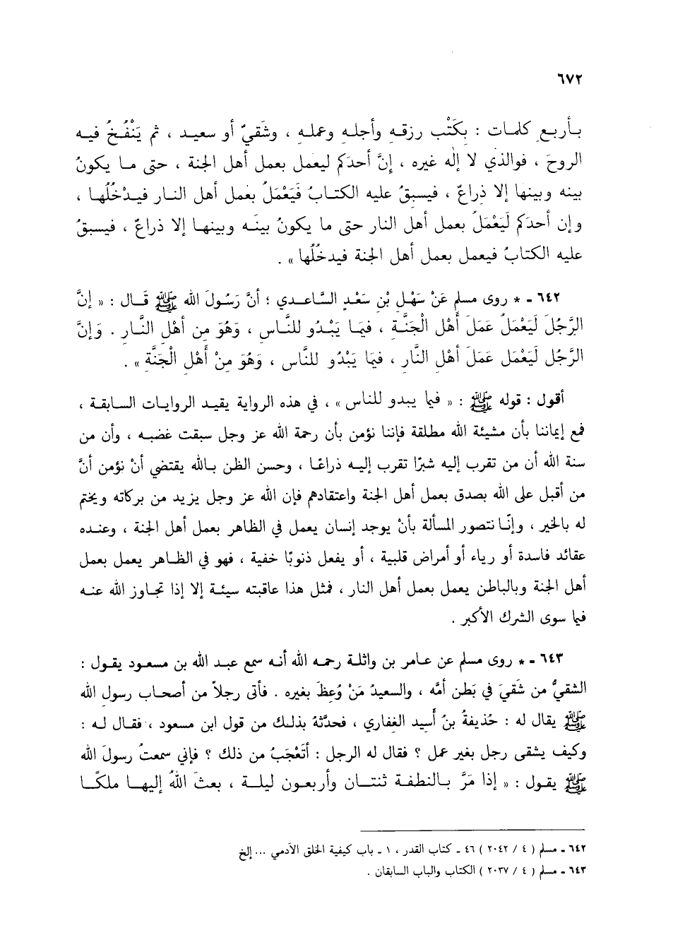 643 - * روى مسلم عن عامر بن وائلة رحمه الله أنه سمع عبد الله بن مسعود يقول: الشقي من شقي في بطن أمه، والسعيد من وُعِظَ بغيره. فأتى رجلاً من أصحاب رسول الله صلى الله عليه وسلم يقال له: حذيفة بن أسيد الغفاري، فحدثه بذلك من قول ابن مسعود فقال له: وكيف يشقى رجل بغير عمل؟ فقال له الرجل: أتعجب من ذلك؟ فإني سمعت رسول الله صلى الله عليه وسلم يقول: "إذا مرَّ بالنطفة ثنتان وأربعون ليلة، بعث الله إليها ملكاً
