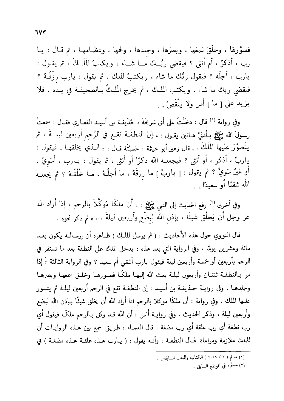 قال النووي حول هذه الأحاديث: (يرسل الملك) ظاهره أن إرساله يكون بعد مائة وعشرين يوماً، وفي الرواية التي بعد هذه: يدخل الملك على النطفة بعد ما تستقر في الرحم بأربعين أو خمسة وأربعين ليلة فيقول يا رب أشقي أم سعيد؟ وفي الرواية الثالثة: إذا مر بالنطفة ثنتان وأربعون ليلة بعث الله إليها ملكاً فصورها وخلق سمعها وبصرها وجلدها. وفي رواية حذيفة بن أسيد: إن النطفة تقع في الرحم أربعين ليلة ثم يتسور عليها الملك. وفي رواية: أن ملكاً موكلاً بالرحم إذا أراد الله أن يخلق شيئاً بإذن الله لبضع وأربعين ليلة، وذكر الحديث. وفي رواية أنس: أن الله قد وكل بالرحم ملكاً فيقول أي رب نطفة أي رب علقة أي رب مضغة. قال العلماء: طريق الجمع بين هذه الروايات أن للملك ملازمة ومراعاة لحال النطفة، وأنه يقول: (يا رب هذه علقة هذه مضغة) في