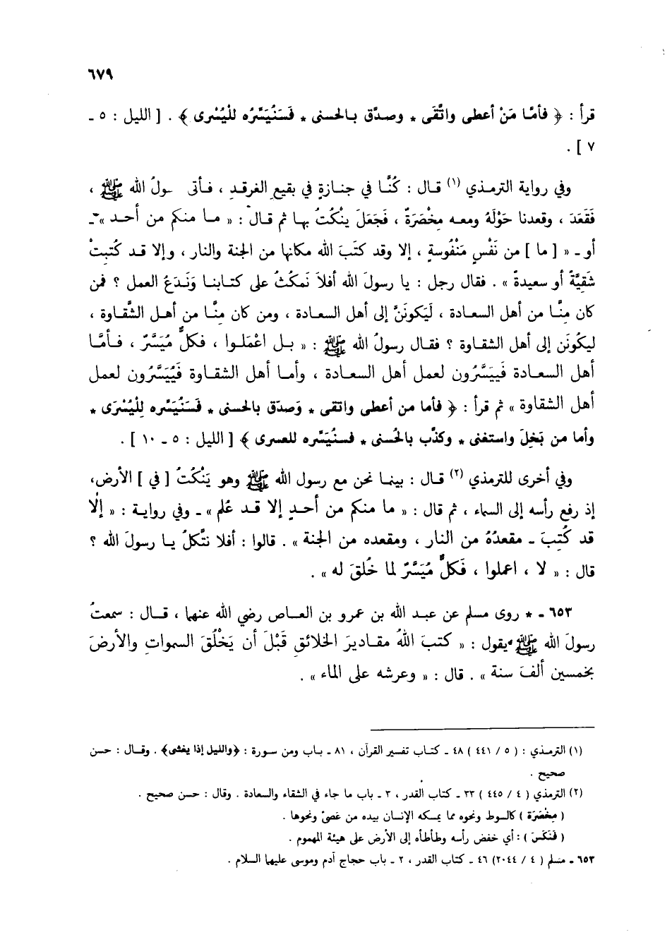 653 - * روى مسلم عن عبد الله بن عمرو بن العاص رضي الله عنهما، قال: سمعت رسول الله صلى الله عليه وسلم يقول: "كتب الله مقاديز الخلائق قبل أن يخلق السموات والأرض بخمسين ألف سنة. قال: "وعرشه على الماء".